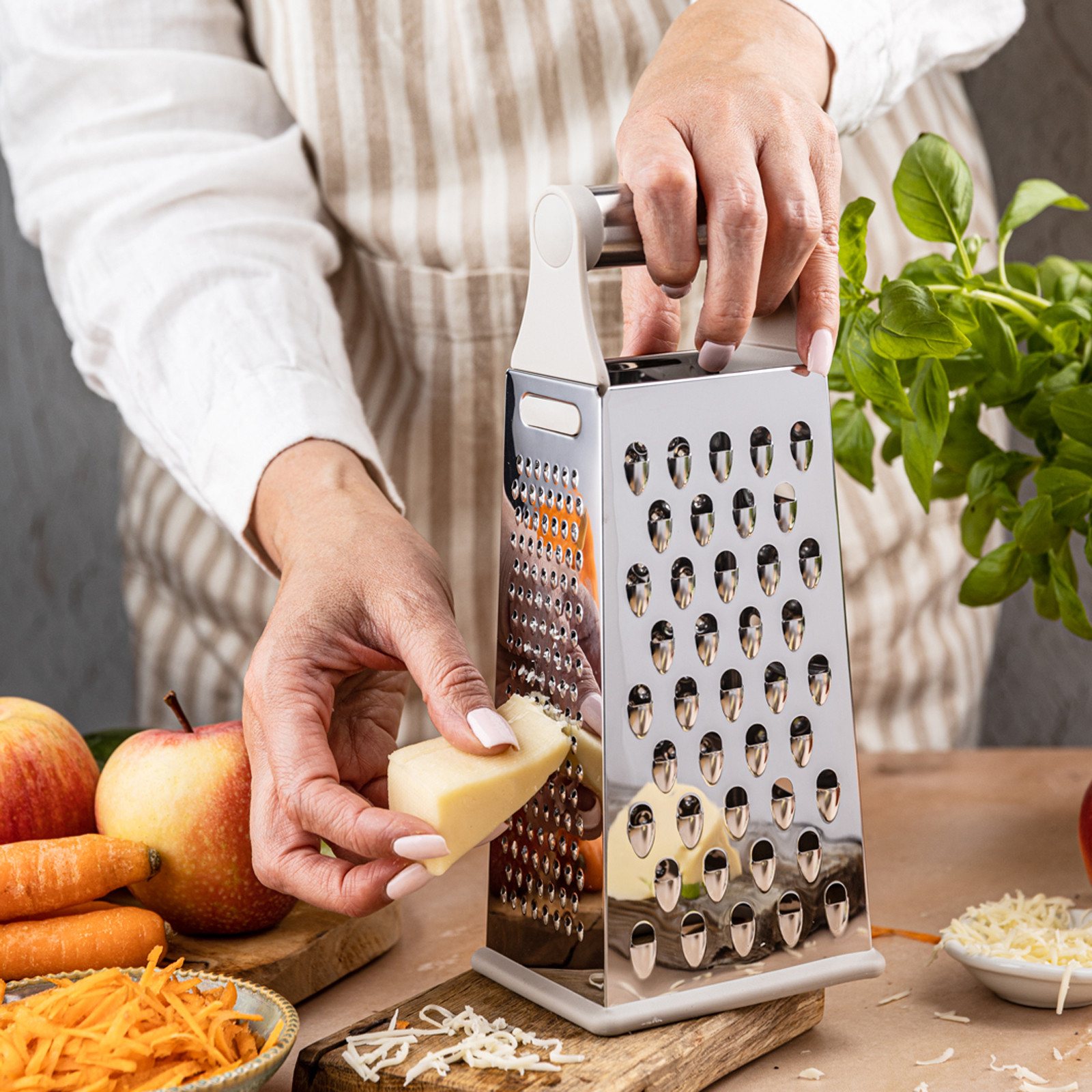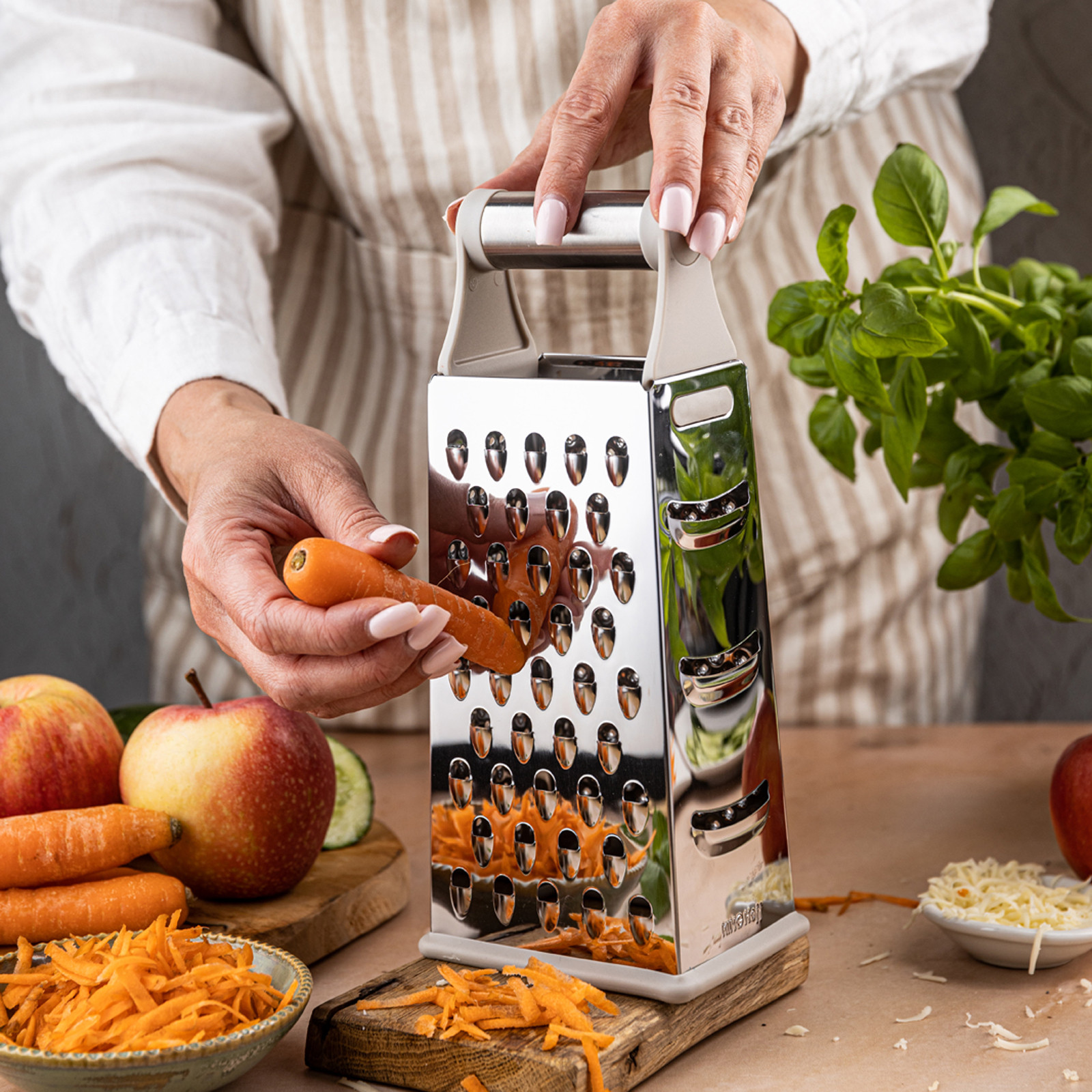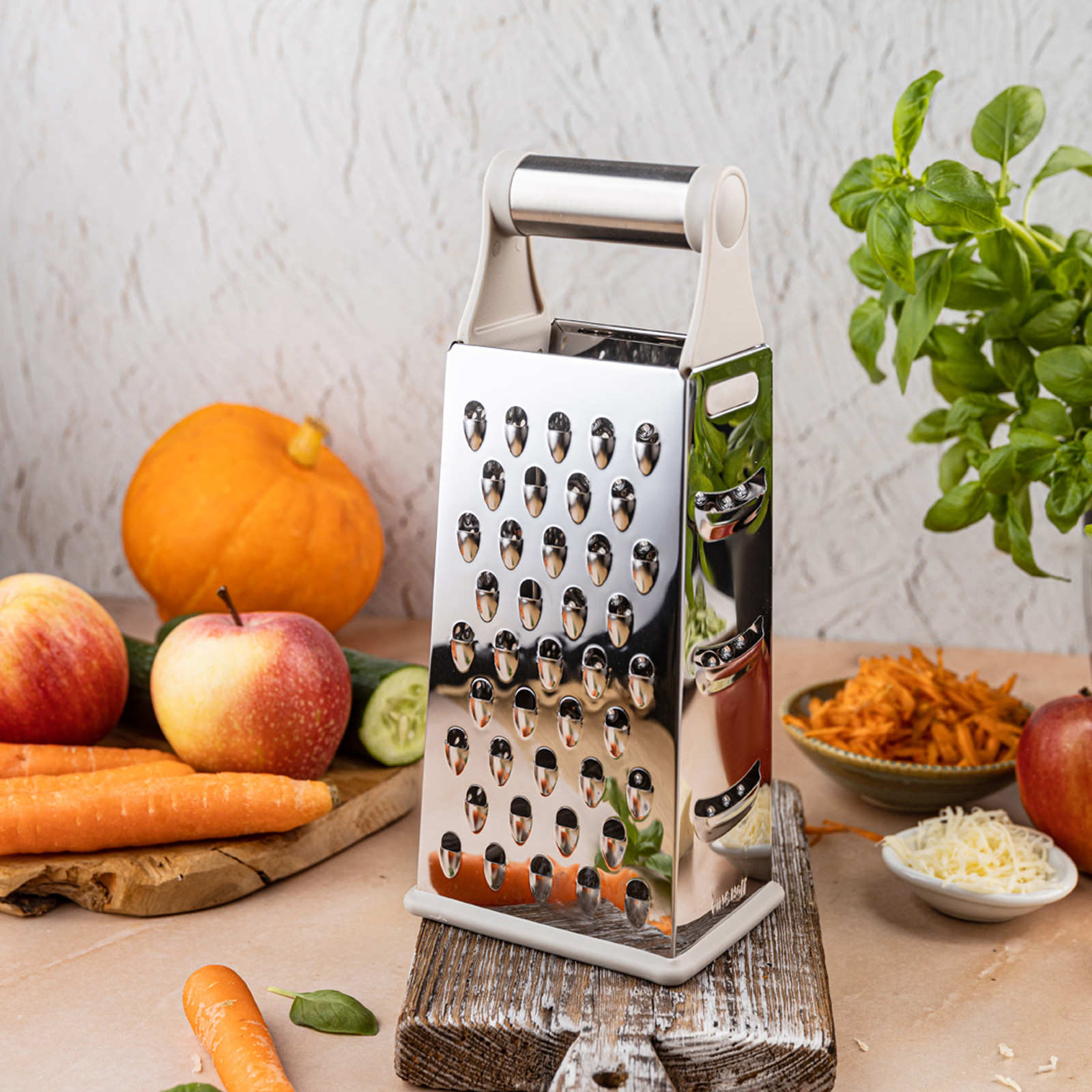 4 różne strony tarki – do tarcia grubego, drobnego, ścinania plasterków i krojenia warzyw