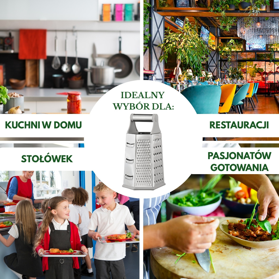 Tarka 6-stronna KINGHoff KH-1991 to idealne rozwiązanie dla osób, które cenią sobie różnorodność i funkcjonalność w gotowaniu. Dzięki sześciu różnym powierzchniom ścierającym z łatwością przygotujesz warzywa, sery, owoce czy czekoladę dokładnie tak, jak lubisz. Wykonana z wysokiej jakości stali nierdzewnej, jest trwała i odporna na korozję, a jej ergonomiczny uchwyt zapewnia komfort nawet przy dłuższym użytkowaniu.
