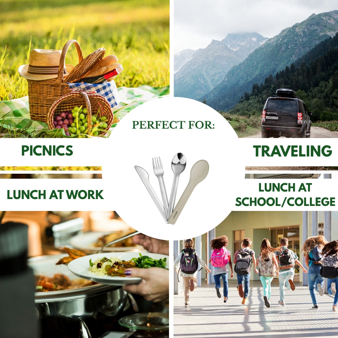 Zestaw 3 w 1 zawiera nóż, widelec i łyżkę – wszystko, czego potrzebujesz do komfortowego posiłku w każdych warunkach. Kompaktowe rozmiary i lekka konstrukcja sprawiają, że zestaw łatwo zmieści się w torbie, plecaku czy lunchboxie. To doskonała alternatywa dla jednorazowych sztućców, przyjazna środowisku i wielokrotnego użytku.