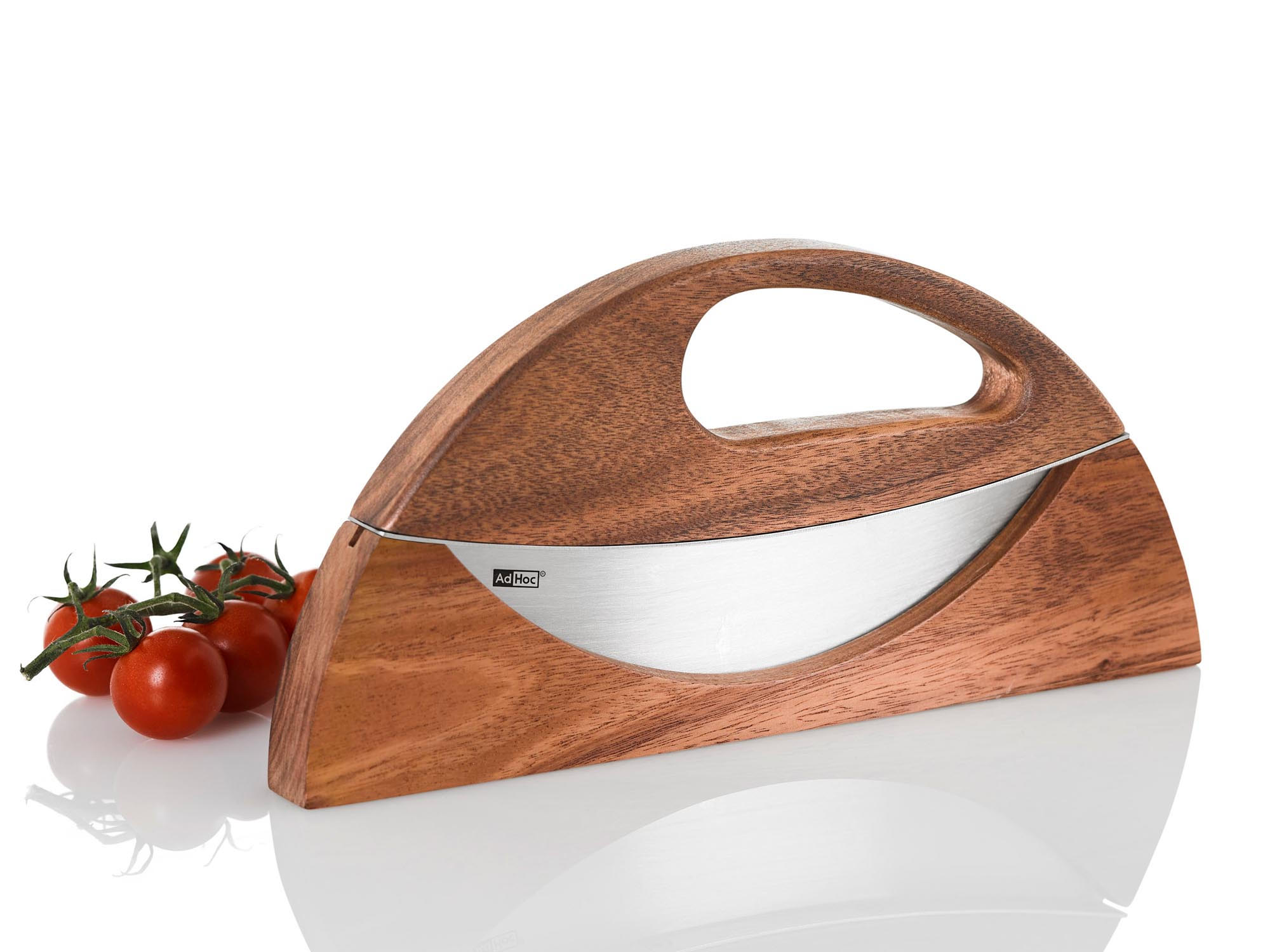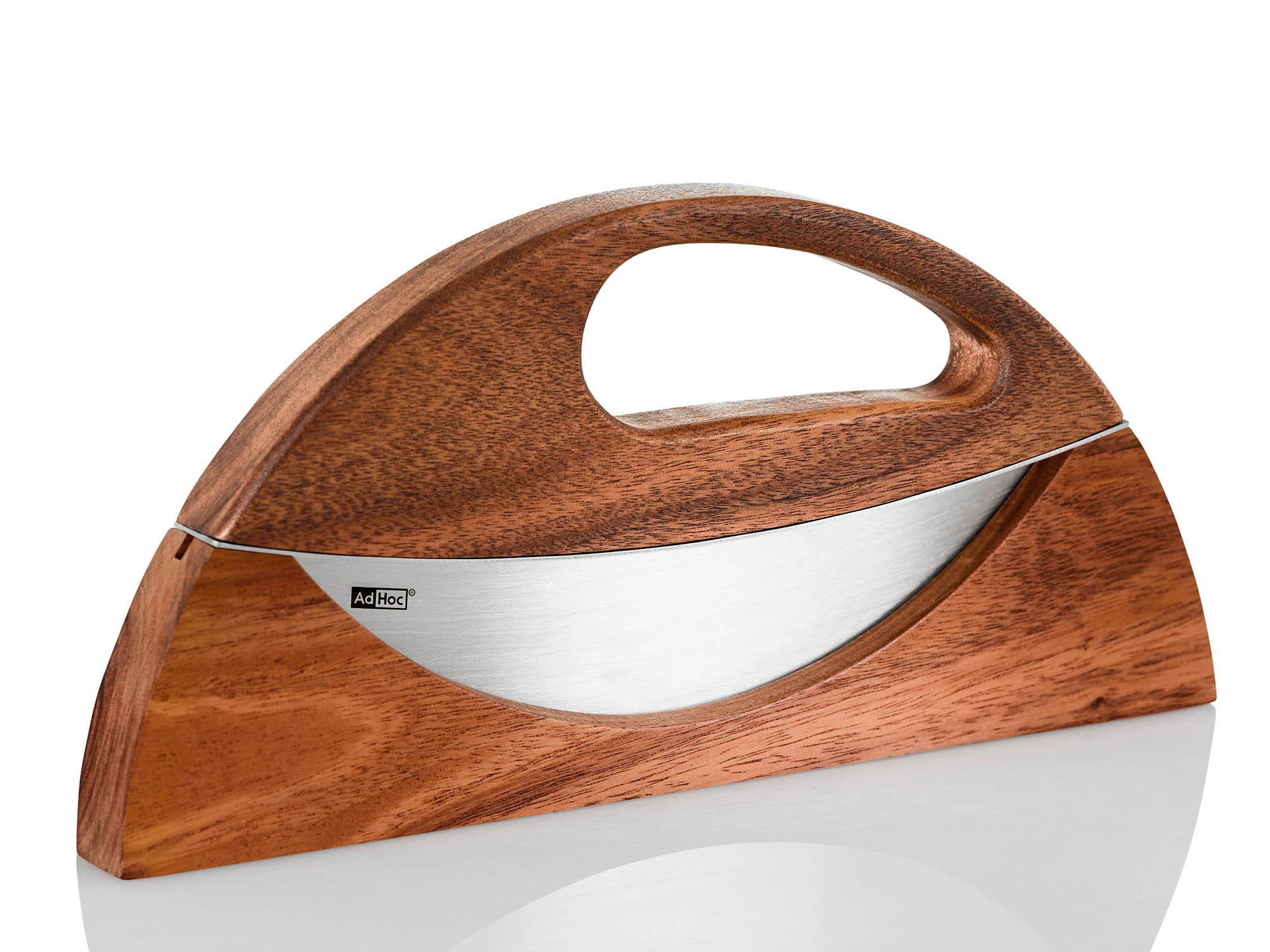 Stworzony do siekania ziół, krojenia pizzy i nie tylko! Wygodny i prosty w użyciu dzięki dopasowanemu do dłoni uchwytowi. W zestawie znajduje się podstawka do przechowywania. Nie należy myć w zmywarce. Produkt został zaprojektowany przez Gabriele Kaltenbach. Materiał: drewno akacjowe, stal nierdzewna. Wymiary noża: długość – 19,8cm, szerokość – 2,2cm, wysokość – 10,2cm. Wymiary z podstawą: długość – 23,2cm, szerokość – 2,2cm, wysokość – 10,9cm.