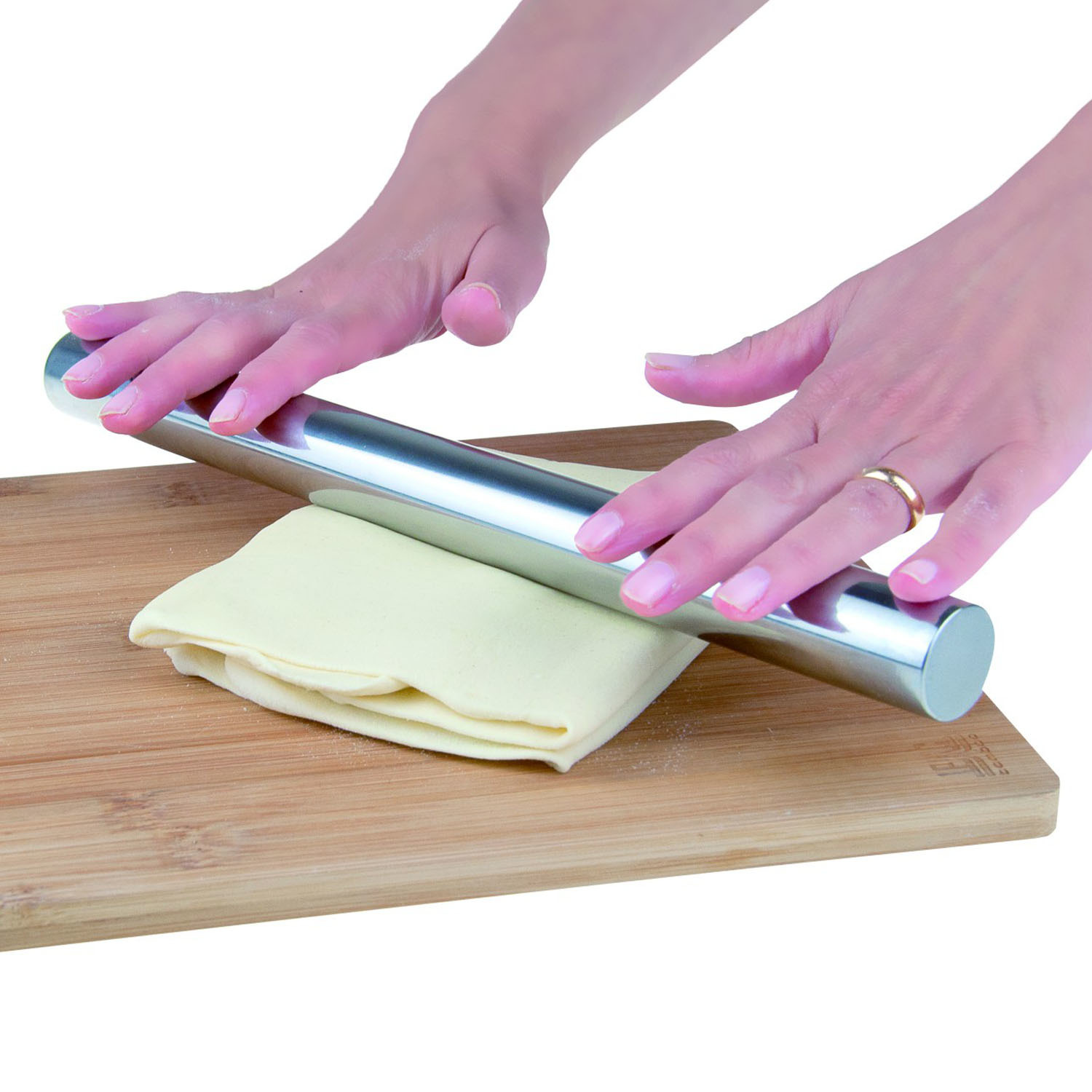 Profesjonalny wałek ze stali nierdzewnej do rozwałkowywania słodkiego lub słonego ciasta. Dzięki wykorzystaniu stali nierdzewnej można go stosować do wszystkich lepiących się ciast. Dla lepszego efektu można włożyć go do zamrażarki, co w połączeniu z zawartym w jego wnętrzu płynem sprawi, że idealnie sprawdzi się w wałkowaniu szczególnie tych ciast, które potrzebują niskich temperatur jak ciasto francuskie i inne kruche ciasta. Można myć w zmywarce. Materiał: stal nierdzewna. Wymiary brutto: 36×4,7x3cm. Wymiary: 29×2,5×2,5cm. Waga brutto: 0,216kg. Waga netto: 0,197kg.