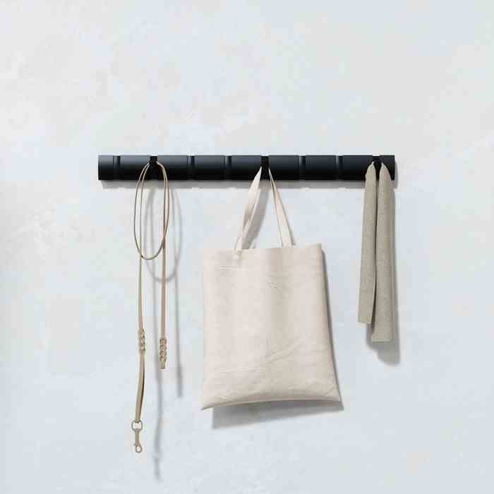 Flip to nowoczesny i funkcjonalny wieszak na ubrania. Wieszak Flip jest montowany na ścianie. Długość wieszaka ok. 80 cm charakteryzuje go dużą przestrzenią do wieszania. Flip charakteryzuje się sprytną konstrukcją z wieloma haczykami, które chowają się, gdy nie są używane, a każdy z nich można starannie wsunąć z powrotem w rowek, zapewniając elegancki wygląd i funkcjonalność oszczędzającą miejsce. Ale nie daj się zwieść kompaktowemu wyglądowi, ponieważ Flip pomieści zaskakująco dużą liczbę przedmiotów, co czyni go idealnym miejscem do wieszania płaszczy, szali, torebek i innych rzeczy. Dzięki eleganckiemu profilowi i ukrytym elementom montażowym Flip można bezproblemowo zamontować na praktycznie każdej ścianie i oferuje stylizację, która wygląda świetnie w każdym przedpokoju lub przedpokoju, niezależnie od tego, jak duży czy mały jest.