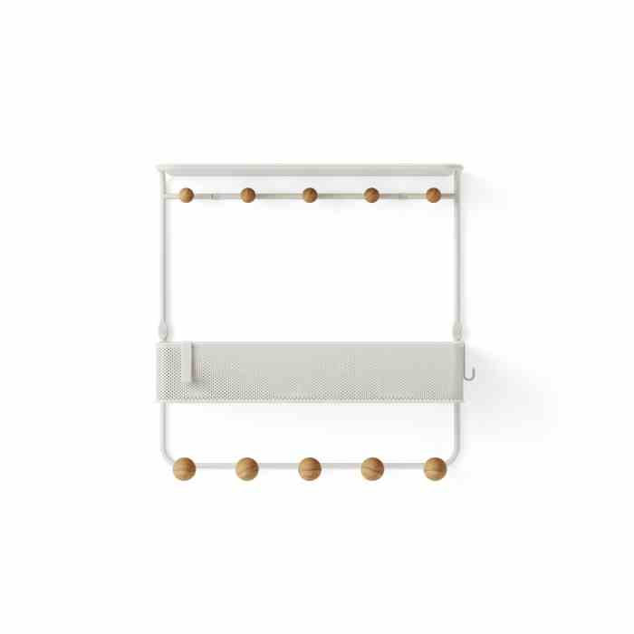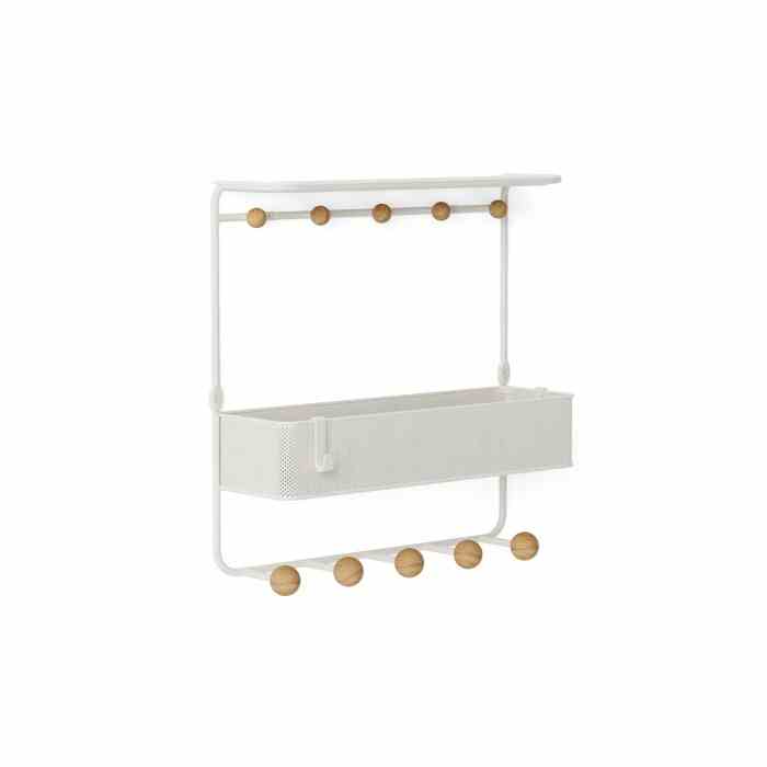 Wieszak z półkami w kolorze białym i naturalnym brązowym ESTIQUE Umbra to nowoczesne i wszechstronne rozwiązanie do przechowywania w przedpokoju i nie tylko! Wieszak z półkami Estique to idealne miejsce do przechowywania codziennych przedmiotów przed wyjściem za drzwi. Estique ma perforowany metalowy kosz z wbudowaną górną tacką i 10 haczykami, co zapewnia dużo miejsca do przechowywania kluczy, poczty, kurtek, toreb i innych codziennych niezbędnych rzeczy.