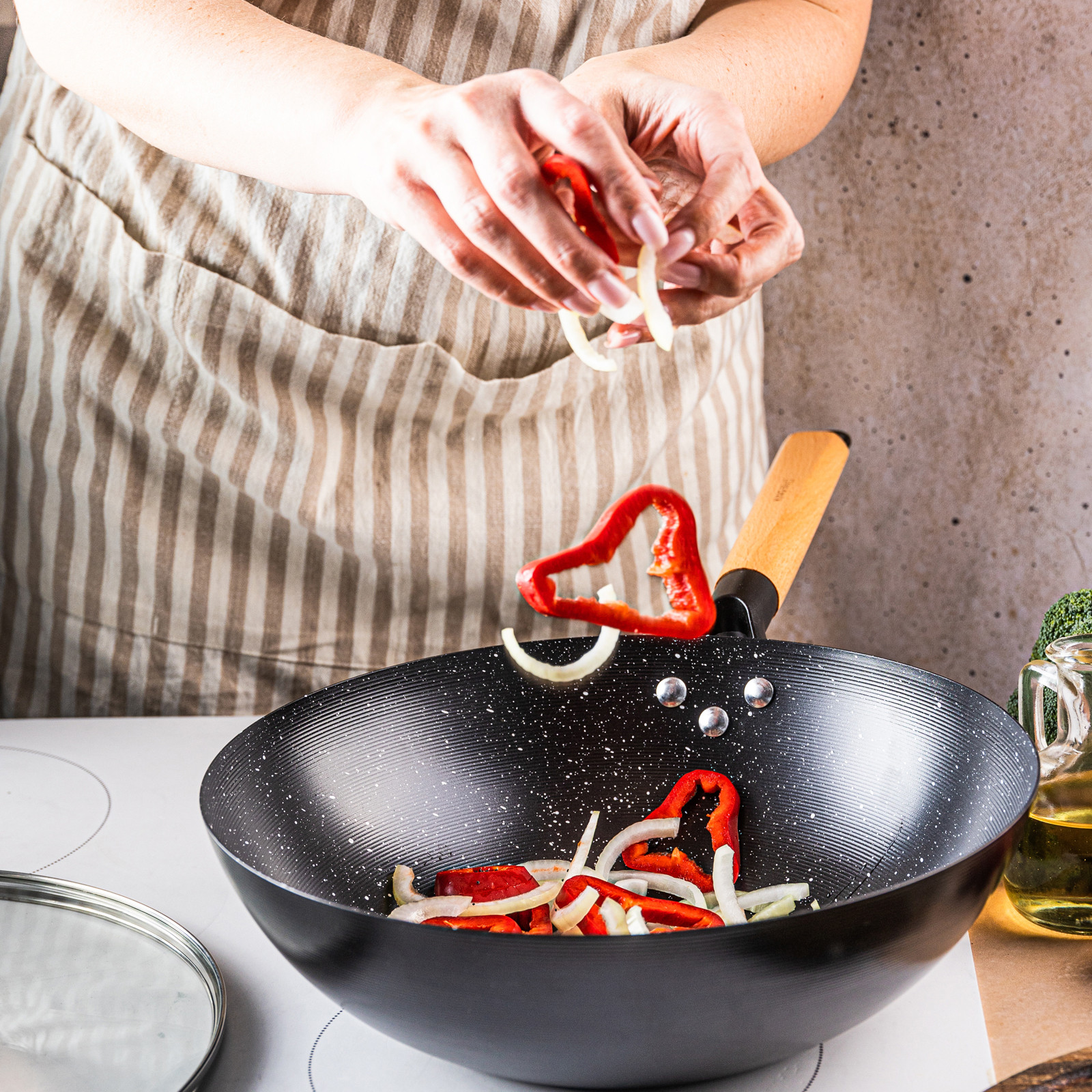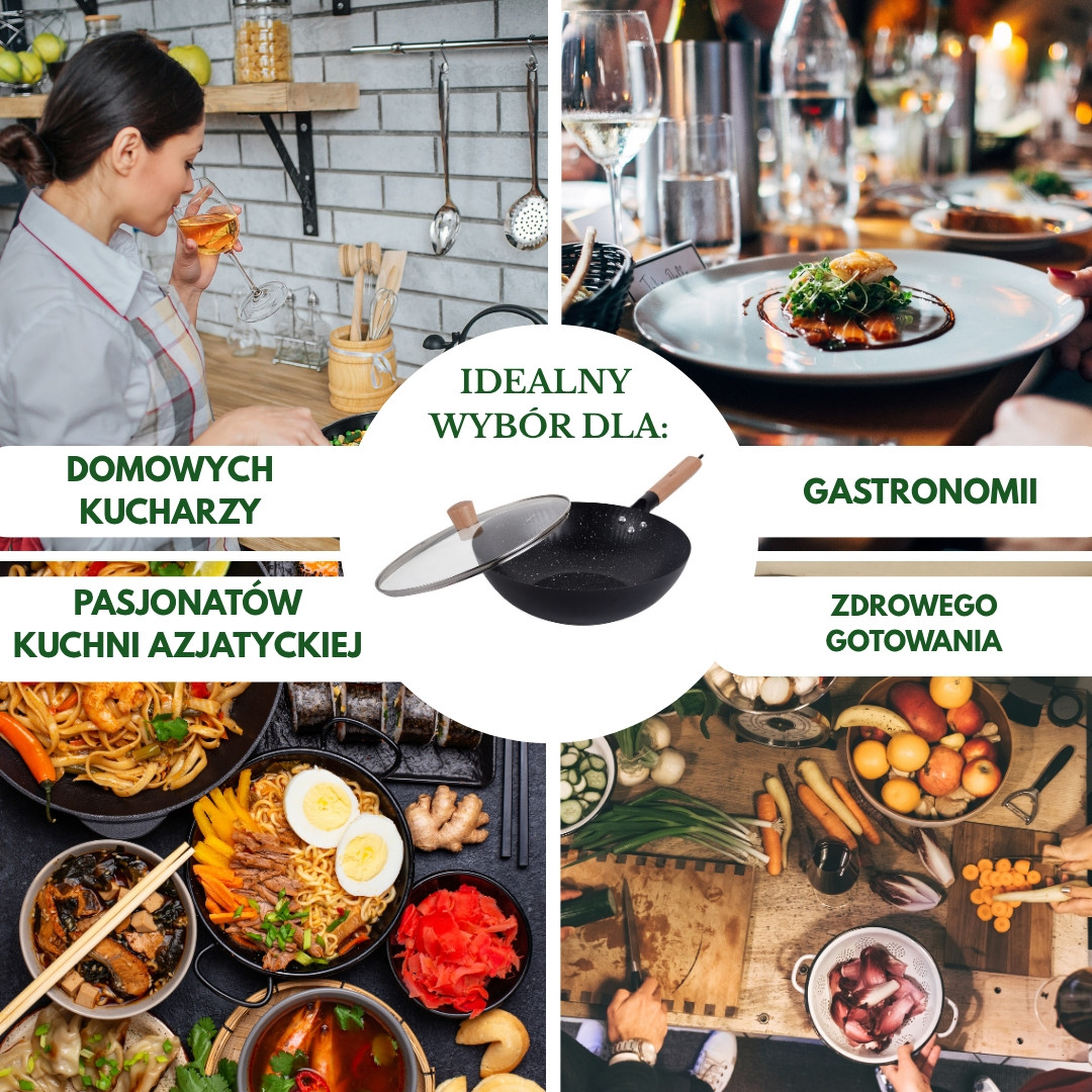 Dzięki marmurkowej powłoce nieprzywierającej przygotujesz potrawy szybko i bez przypaleń, a drewniany uchwyt gwarantuje komfort oraz bezpieczeństwo użytkowania. Zestaw zawiera szklaną pokrywkę z wentylem pary, dzięki której wok sprawdza się nie tylko do stir-fry, ale też do duszenia i gotowania na parze.