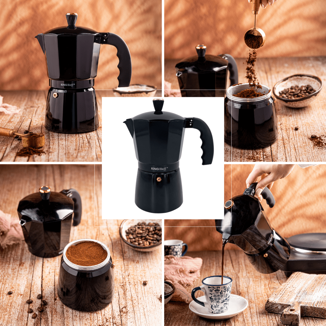 Jeśli parzenie espresso to codzienny rytuał, model KINGHoff KH-1884 sprawdzi się znakomicie. Ten aluminiowy zaparzacz o pojemności 9 filiżanek łączy funkcjonalność z nowoczesnym designem. Czarne, matowe wykończenie z detalami w kolorze rose gold dodaje mu charakteru i subtelnej elegancji.