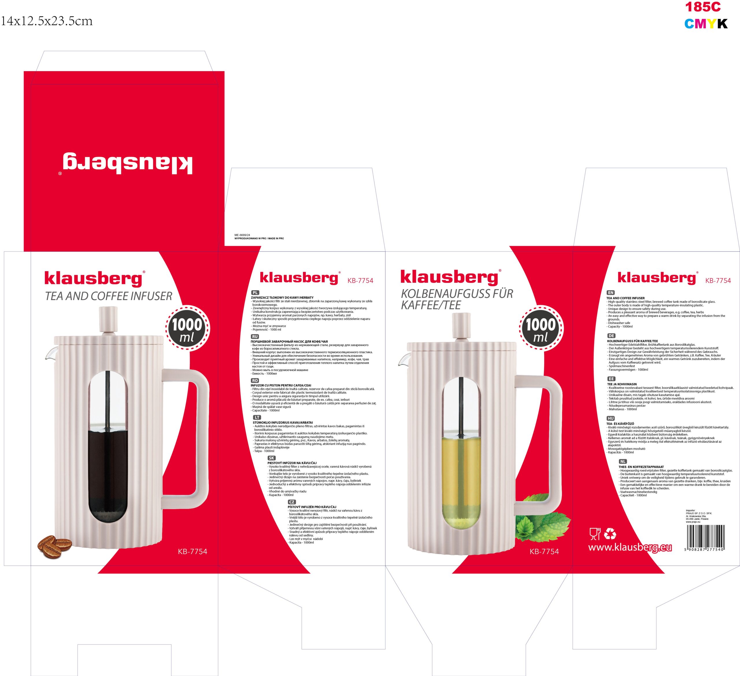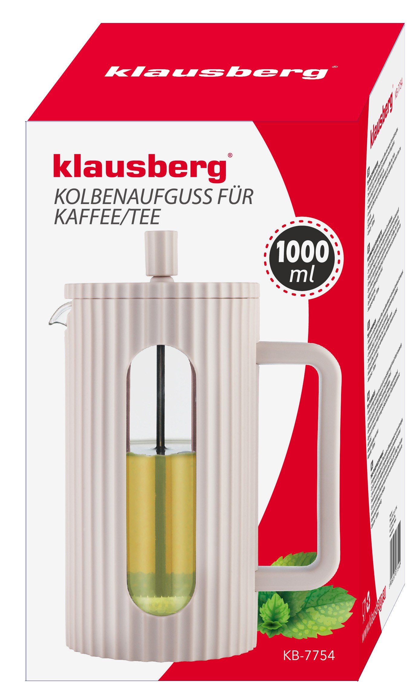Stylowy i funkcjonalny zaparzacz Klausberg o pojemności 1 litra to praktyczne rozwiązanie dla miłośników aromatycznych napojów. W eleganckim, pastelowobeżowym kolorze i z żłobioną fakturą, doskonale odnajdzie się zarówno w nowoczesnej kuchni, jak i w biurze czy podczas spotkań z przyjaciółmi. Dzięki zastosowaniu wysokiej jakości materiałów i przemyślanej konstrukcji przygotowanie ulubionej kawy, herbaty lub ziół staje się wyjątkowo proste i wygodne.