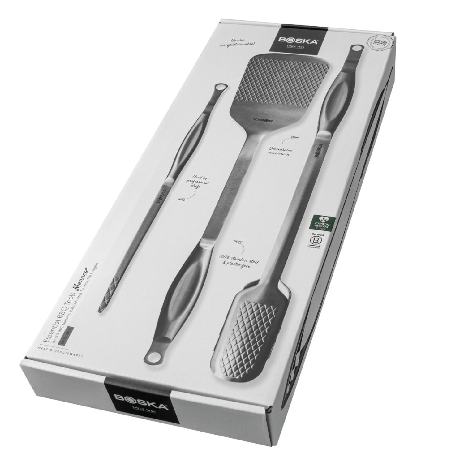 Zestaw trzech stalowych narzędzi BBQ Monaco+ to wszystko, czego potrzebujesz do bezpiecznego grillowania. W skład zestawu wchodzi: – pęseta do delikatnych kawałków mięs i warzyw, – łopatka do przewracania burgerów i nie tylko, – szczypce do solidnych porcji. Narzędzia, są wykonane w 100% ze stali nierdzewnej, mają antypoślizgowy, diamentowy wzór zapewniający pewny chwyt przy obracaniu, wkładaniu i zdejmowaniu potraw z grilla, a dodatkowo zostały przetestowane przez naszych ekspertów od grillowania. Zestaw sprawdzi się zarówno na grillu, jak i w kuchni przy przygotowaniu potraw. Dołączone haki w kształcie litery S w zestawie ułatwią przechowywanie. Profesjonalna pęseta do grilla Monaco+ pozwala bezpiecznie obchodzić się z kawałkami mięsa, ryb i warzyw na grillu. Dzięki ostrym końcówkom i romboidalnemu wzorowi, takie przysmaki jak skrzydełka z kurczaka i plastry cukinii, to bułka z masłem do podniesienia i przewrócenia, to poręczne narzędzie, które jest popularne wśród wielu szefów kuchni i ekspertów od grillowania. Łopatka BBQ służy do obracania burgerów i innych płaskich potraw podczas grillowania. Dzięki płaskiej, zaokrąglonej krawędzi z łatwością wsuniesz ją pod każdy rodzaj grillowanego jedzenia. A długa rączka zapewni Ci bezpieczny dystans. Solidne szczypce do grillowania dzięki zębom i wzorowi w romby gwarantują pewne chwycenie porcji w trakcie obracania. Zestaw BBQ Monaco+ do grillowania to Twój partner podczas grillowania. Narzędzia można myć w zmywarce, ale po zakończeniu cyklu należy je natychmiast wyjąć i osuszyć jak każdą stal. Materiał: stal nierdzewna. Opakowanie: kartonowe pudełko prezentowe.