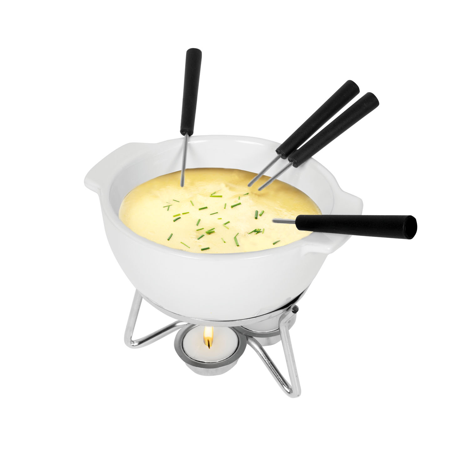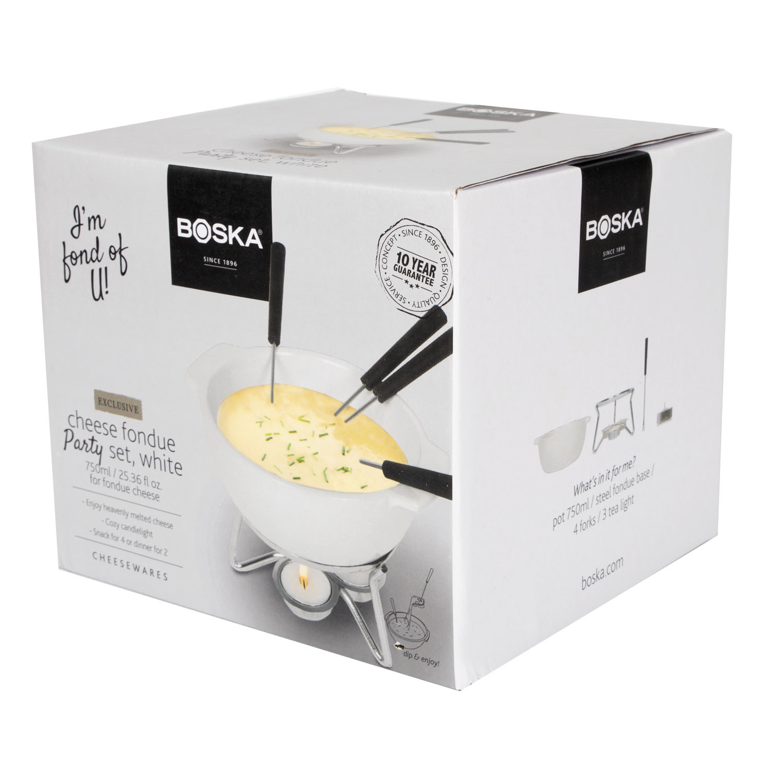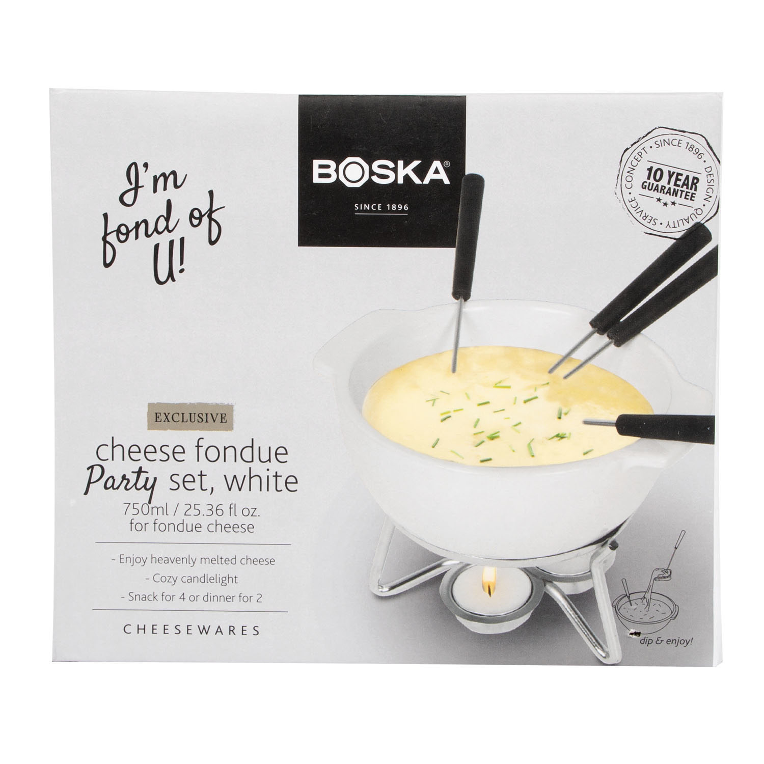 Zestaw do fondue Party 750 ml jest idealny na romantyczny wieczór we dwoje lub na małe spotkania w kręgu przyjaciół i rodziny. Ceramika delikatnie przenosi ciepło z 3 podgrzewaczy na roztopiony ser, sprawiając tym samym, że pozostaje on gęsty i gładki. Naczynia ceramicznego można użyć w kuchni mikrofalowej, co znacznie skraca czas przygotowania fondue. Są różne metody przygotowywania serowego fondue, ale zalecamy przygotować je w większym naczyniu a następnie ostrożnie przelać. Garnek do fondue posiada grubą warstwę glazury, odpornej na zarysowania. Biała ceramiczna misa z uchwytami i metalowy stojak to praktyczne rozwiązanie. Nic tylko przygotować pieczywo do zanurzenia!