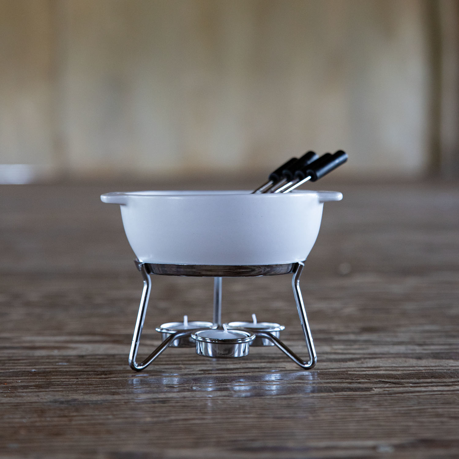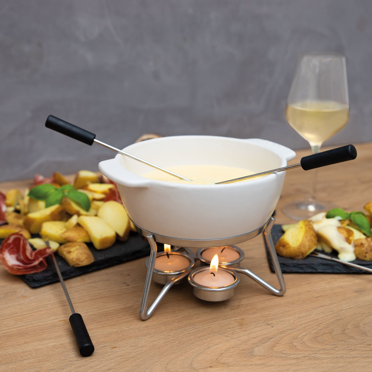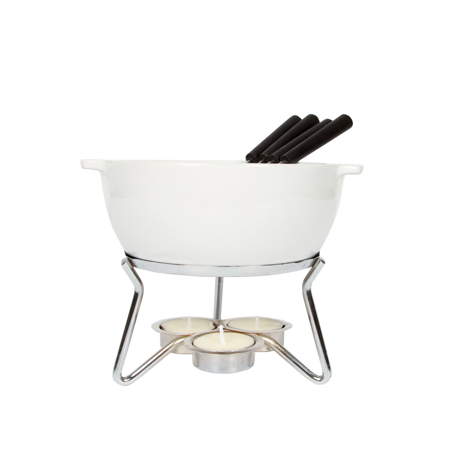 Zestaw do fondue Party 750 ml jest idealny na romantyczny wieczór we dwoje lub na małe spotkania w kręgu przyjaciół i rodziny. Ceramika delikatnie przenosi ciepło z 3 podgrzewaczy na roztopiony ser, sprawiając tym samym, że pozostaje on gęsty i gładki. Naczynia ceramicznego można użyć w kuchni mikrofalowej, co znacznie skraca czas przygotowania fondue. Są różne metody przygotowywania serowego fondue, ale zalecamy przygotować je w większym naczyniu a następnie ostrożnie przelać. Garnek do fondue posiada grubą warstwę glazury, odpornej na zarysowania. Biała ceramiczna misa z uchwytami i metalowy stojak to praktyczne rozwiązanie. Nic tylko przygotować pieczywo do zanurzenia!