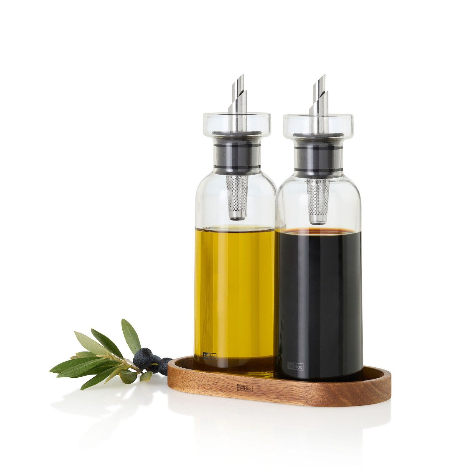 Zestaw dyspenserów do oliwy/octu AROMAPOUR 300ml z podstawką z drewna akacjowego. Dyspensery do oliwy lub octu AROMA POUR o pojemności 300ml z szkła borokrzemowego z nalewakiem grawitacyjnym ze stali nierdzewnej wykończonym silikonowym kołnierzem uszczelniającym. Dozowniki do oleju lub octu AROMAPOUR marki Ad Hoc są wykonane ze szkła borokrzemowego i wyposażone w sprytne nalewaki, które nie tylko zapobiegają kapaniu, ale odprowadzają krople z powrotem do butelki. Filtr ze stali nierdzewnej zatrzymuje zioła i przyprawy podczas nalewania. Rozwiązanie typu GravitySeal zapewnia hermetyczne zamknięcie. Wszystkie elementy można myć w zmywarce. Należy jednak przy tym przestrzegać zasad mycia metalu i tworzyw w zmywarce, elementy metalowe powinny być wyjęte ze zmywarki natychmiast po zakończeniu cyklu mycia i dokładnie wytarte do sucha a temperatura mycia nie powinna przekraczać 40oC w związku z kołnierzem uszczelniającym wykonanym z silikonu. Brak przestrzegania powyższych zaleceń oraz stosowanie agresywnych środków do mycia może przyczynić się do uszkodzenia tworzywa i powstania ognisk rdzy. Materiał: szkło borokrzemowe, stal nierdzewna, silikon, tworzywo, podstawka – drewno akacjowe. Przybliżone wymiary dyspensera: – pojemność: 300ml, – wysokość: 21cm, – średnica dół: 5,8cm. Przybliżone zewnętrzne wymiary podstawki: długość: 16cm, – wysokość: 1,5cm, – szerokość: 8,5cm. Przybliżone wewnętrzne wymiary podstawki: – długość: 14cm, – wysokość: 1cm, – szerokość: 7cm. Przybliżone wymiary brutto: – wysokość: 25cm, – długość: 16,5cm, – szerokość: 9cm. Przybliżona waga brutto: 0,602kg. Opakowanie: kartonowe pudełko prezentowe.