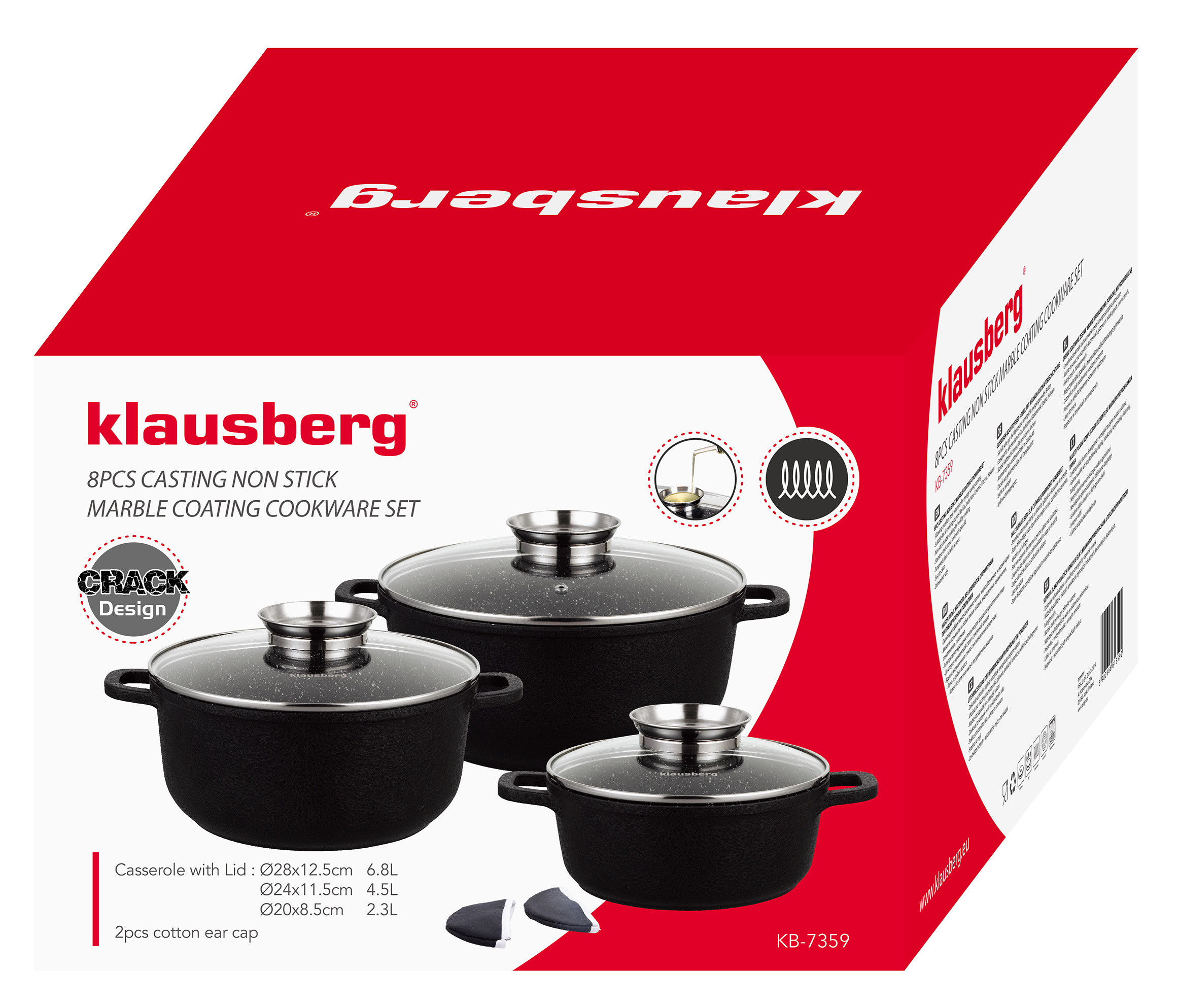 8 elementowy zestaw garnków z niezwykle trwałą powłoką granitową. Z zewnątrz pokryte powłoką o porowatej, spękanej strukturze Crack Design. Daje to ciekawy efekt wizualny. Wyposażony w pokrywki szklane z uchwytem Aroma Knob w którym umieszczono dozownik oleju, dzięki któremu podczas gotowania lub duszenia można podawać olej lub płynne przyprawy.