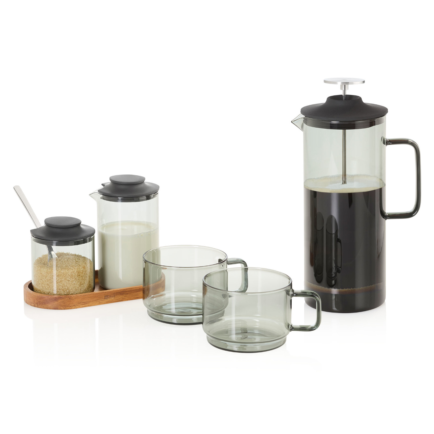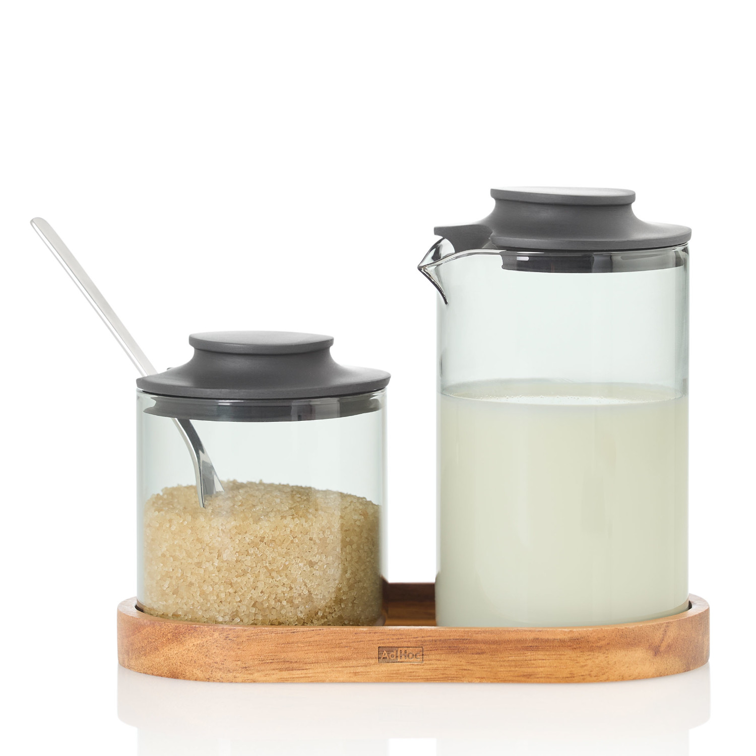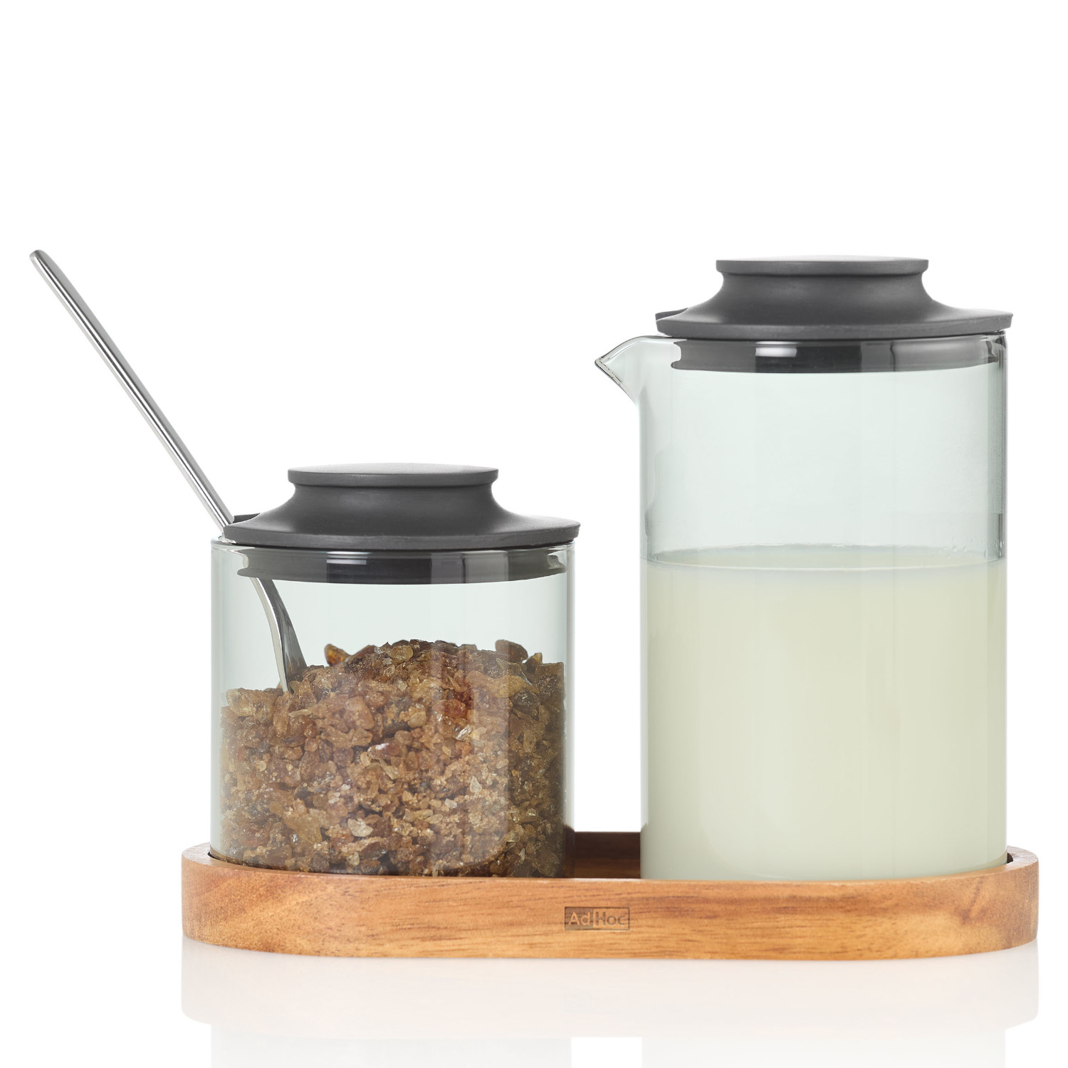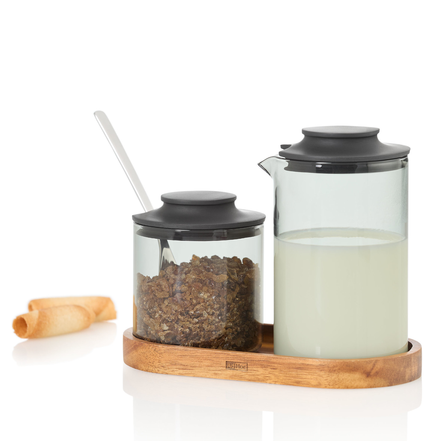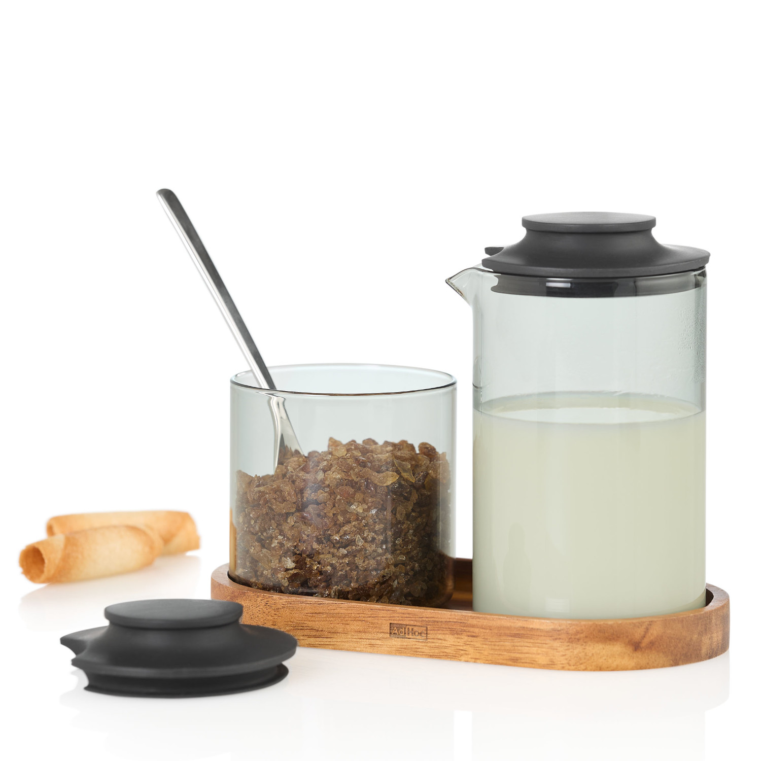 Zestaw Ipmact mlecznik i cukiernica z podstawką z drewna akacjowego łączy funkcjonalność i ponadczasowy design. Naczynia zostały wykonane z żaroodpornego szkła borokrzemowego, materiału nie wpływającego na smak przechowywanych w nim produktów. Dzbanek do mleka ma pojemność ok. 250 ml a precyzyjny dzióbek pozwala na korzystanie z dzbanka bez rozlewania. Cukierniczka pomieści ok 180 gramów cukru. Elastyczne silikonowe pokrywki są łatwe w zakładaniu i bezpieczne dla szklanych korpusów. Podstawka wykonana naturalnego drewna akacjowego o średnicy 7 cm ułatwia przenoszenie i cieszy oko. Zestaw zaprojektowany przez Rolanda Kreitera łączy elegancję z przemyślaną, codzienną funkcjonalnością. Szkło i pokrywki można myć w zmywarce, przestrzegając zasad mycia dla poszczególnych materiałów jakkolwiek my zlecamy mycie ręczne, co pozwali uniknąć zmatowienia elementów. Materiał: szkło borokrzemowe, silikon, drewno akacjowe. Przybliżone wymiary mlecznik: wysokość z pokrywką – 12,3cm, wysokość bez pokrywki – 11cm, średnica góra – 7,5cm, średnica dół – 7cm, pojemność – 250ml. Przybliżone wymiary cukiernica: wysokość z pokrywką – 8,5cm, wysokość bez pokrywki – 7cm, średnica – 6,7cm, pojemność – 180g. Przybliżone wymiary podstawka: wysokość – 1,5cm, długość – 15,5cm, szerokość zewnętrzna – 8cm, szerokość wewnętrzna – 7cm. Przybliżone wymiary brutto: wysokość – 14,7cm, długość – 18cm, szerokość – 9,5cm. Przybliżona waga brutto: 0,390kg. Opakowanie: kartonowe pudełko prezentowe.