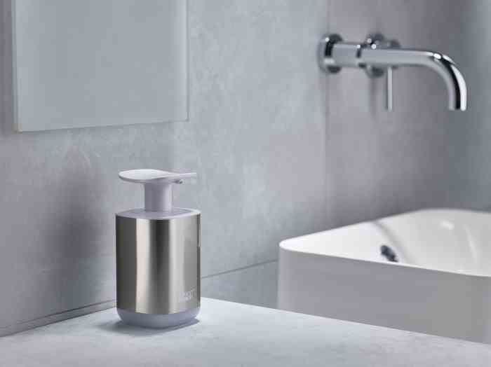 – posiada wykończoną stalą nierdzewną szeroką pompkę – można naciskać ją nadgarstkiem,