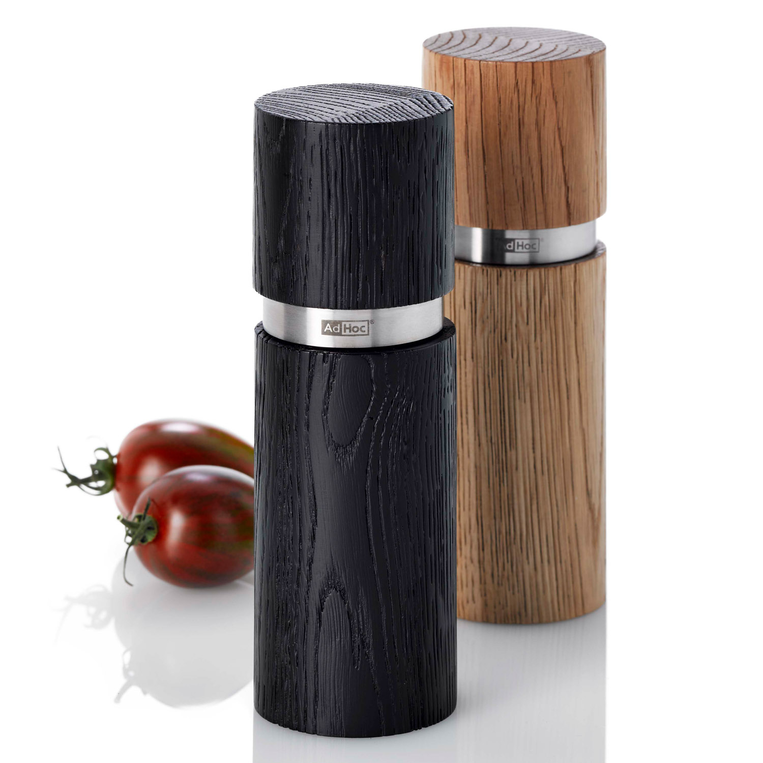 Młynki zostały wyposażone w bardzo wydajne żarna CeraCut®, które są wolne od zapachów i smaków, a także są niezwykle odporne na zużycie i korozję. Młynki posiadają także mechanizm doboru grubości mielenia w pełnej skali od drobnego do grubego rozmiaru. Demontowane obrotowe pokrętło umożliwia łatwe napełnienie młynków. Produkt został zaprojektowany przez Gabriele Kaltenbach. Materiał: drewno dębowe, stal nierdzewna, ceramiczne żarna CeraCut®. Wymiary: średnica – 5cm, wysokość 15cm.