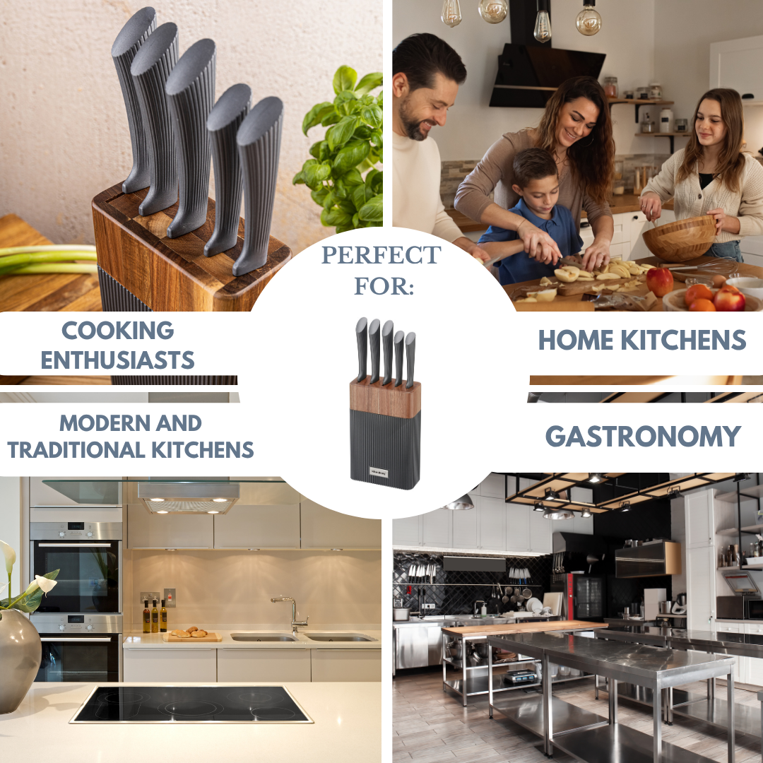 Komplet 6w1 – 5 noży i elegancki blok do przechowywania.