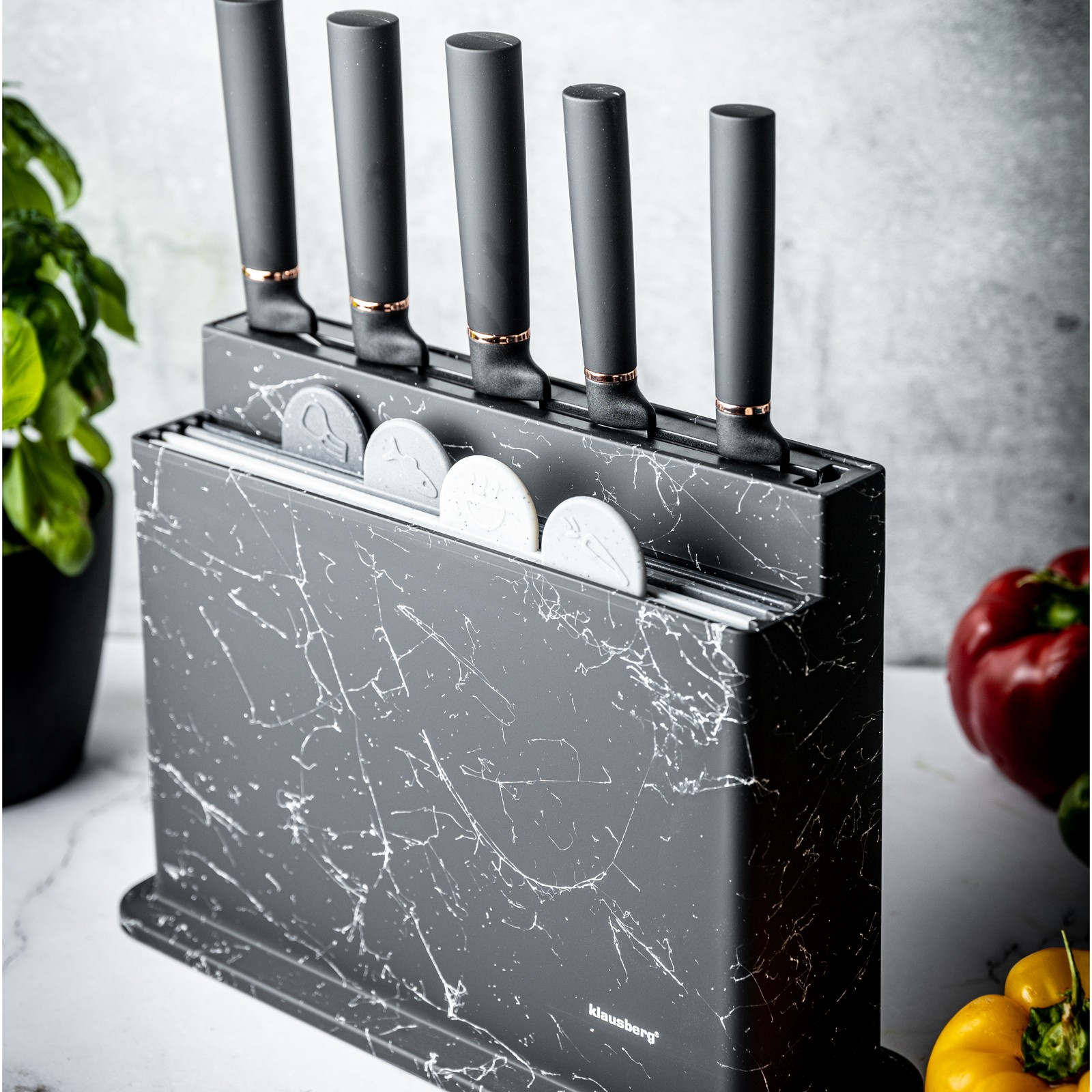 Zestaw noży i desek do krojenia KLAUSBERG KB-7834 to praktyczne i estetyczne rozwiązanie dla każdej kuchni. Wysokiej jakości ostrza noży oraz kolorowe deski, które zapobiegają mieszaniu się różnych produktów podczas krojenia, sprawiają, że przygotowywanie posiłków staje się łatwiejsze, szybsze i bardziej higieniczne. Dzięki porządnemu stojakowi zestaw jest wygodny w przechowywaniu i zawsze gotowy do użycia.