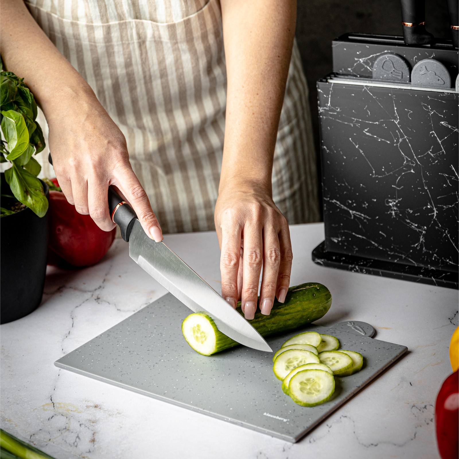 Zestaw noży i desek do krojenia KLAUSBERG KB-7834 to kompletny, 10-częściowy zestaw stworzony z myślą o funkcjonalności i estetyce w kuchni. W zestawie znajdziesz 5 noży wykonanych z wysokiej jakości stali nierdzewnej oraz 4 kolorowe deski do krojenia z trwałego i bezpiecznego tworzywa, które pomagają uniknąć mieszania się różnych rodzajów jedzenia podczas krojenia. Noże o różnej długości i przeznaczeniu ułatwią przygotowanie każdego posiłku, a praktyczny stojak pozwala na wygodne i higieniczne przechowywanie całego zestawu.