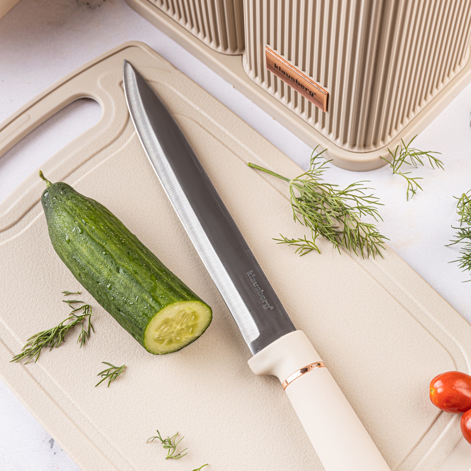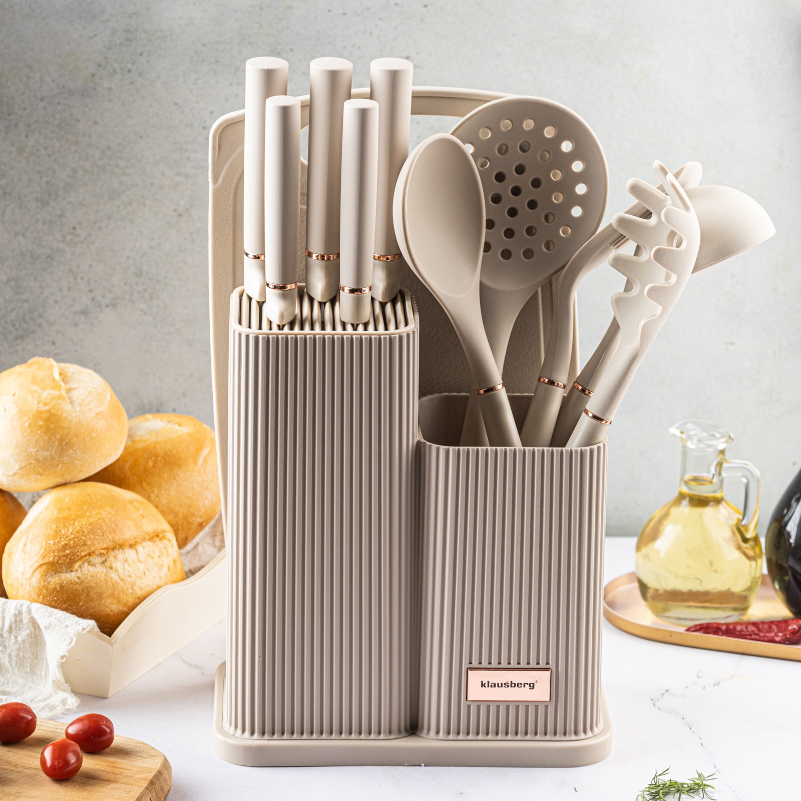 Zestaw kuchenny Klausberg to eleganckie i funkcjonalne wyposażenie każdej kuchni. W nowoczesnym beżowym kolorze, z miękkim wykończeniem i praktycznym stojakiem, zestaw ten łączy styl z wygodą. Zawiera wszystko, czego potrzebujesz do codziennego gotowania – od noży ze stali nierdzewnej po silikonowe przybory odporne na wysoką temperaturę.
