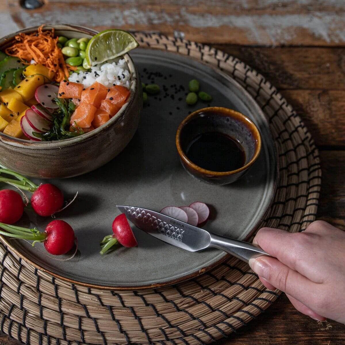 Zestaw trzech noży: Nóż szefa kuchni – do krojenia wszystkiego, nóż Sous Chef – bo czym jest Szef Kuchni bez swojego zastępcy oraz nóż do warzyw – do krojenia warzyw i owoców. Ostrza wykonane zostały z dobrej jakości stali nierdzewnej o optymalnej twardości. Dzięki temu noże będą ostre przez długi czas, są łatwe w utrzymaniu i ostrzeniu. Dodatkowo charakterystyczny wzór rombu na ostrzu zapewnia mniejszy opór podczas cięcia. Noże doskonale leżą w dłoni, dzięki idealnemu wyważeniu ciężaru rękojeści i ostrza. Noże należy myć ręcznie po użyciu. Wystarczy odrobina ciepłej wody i płynu do mycia naczyń. Koniecznie osusz nóż natychmiast po umyciu. Materiał: stal nierdzewna. Opakowanie: kartonowe pudełko.
