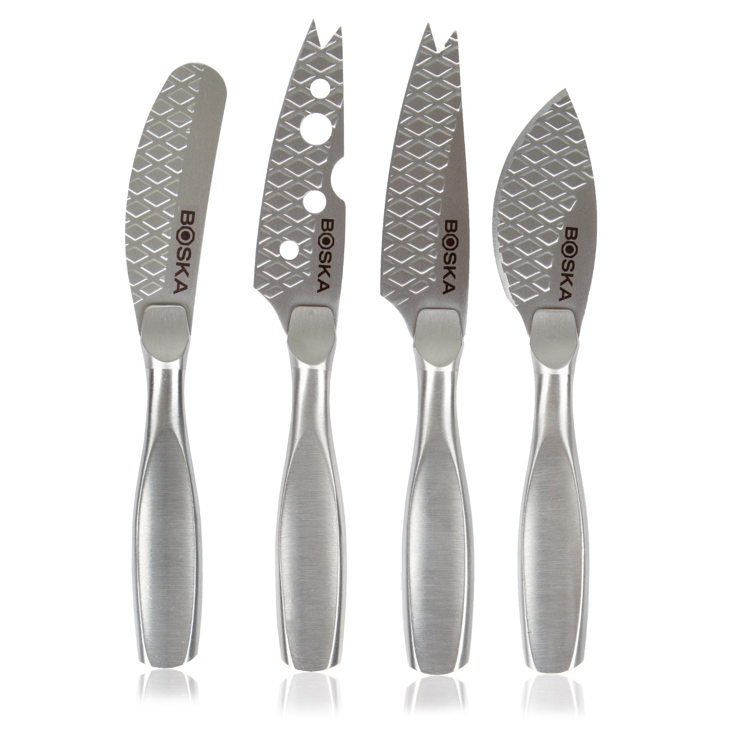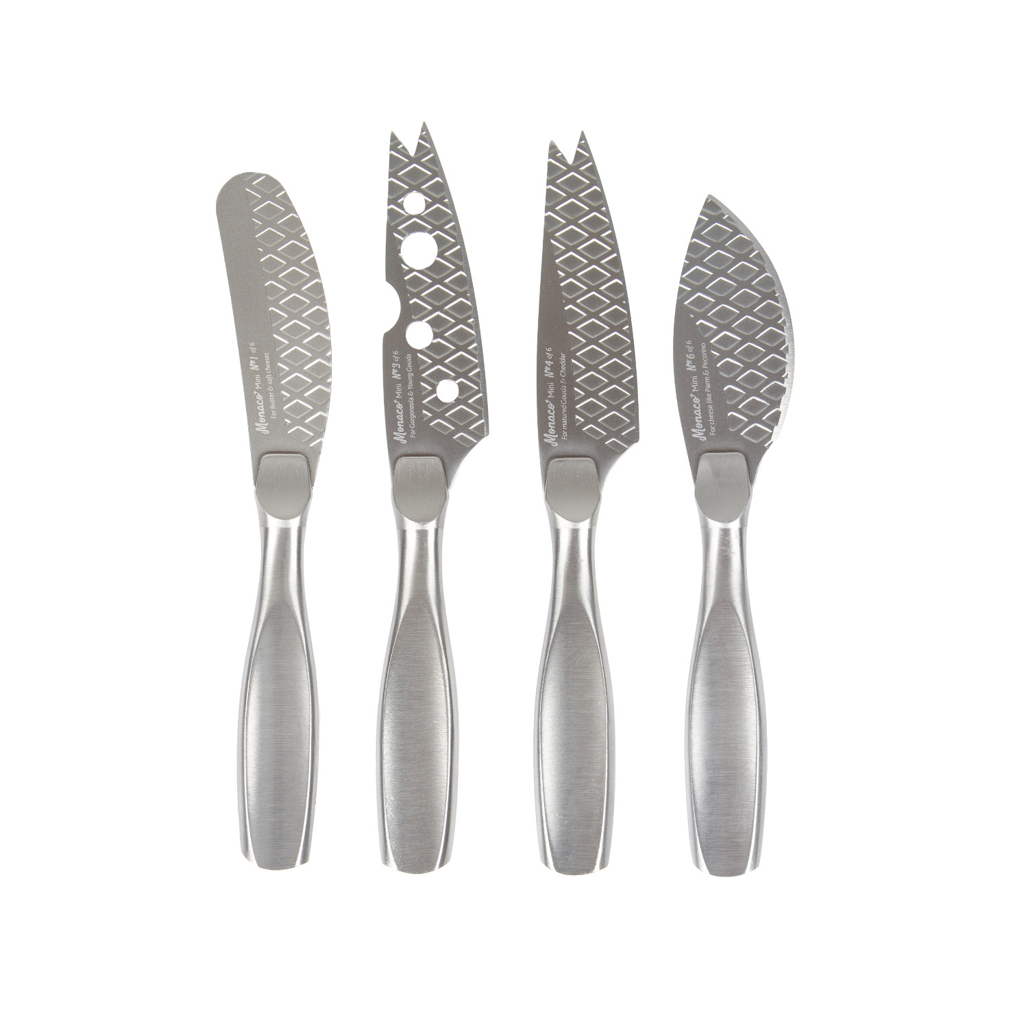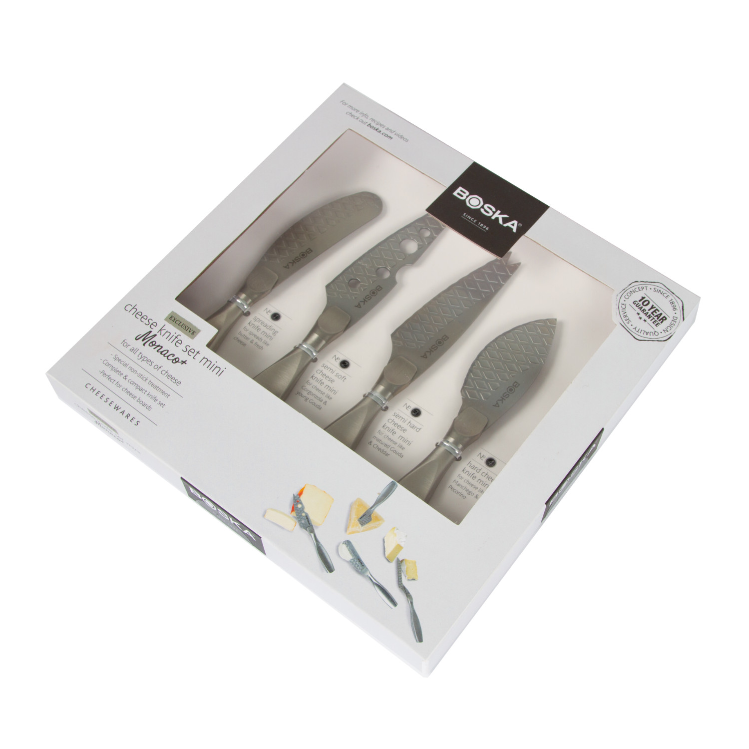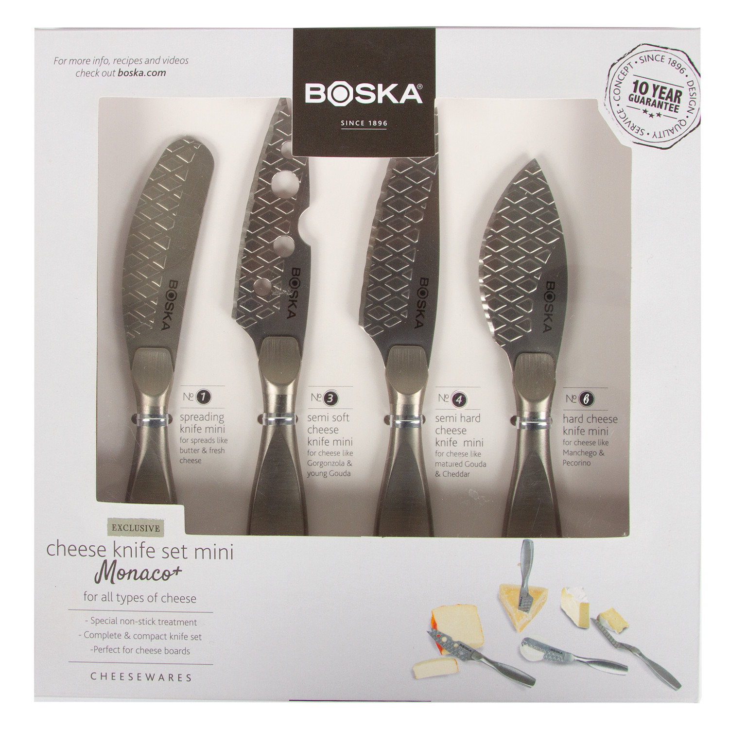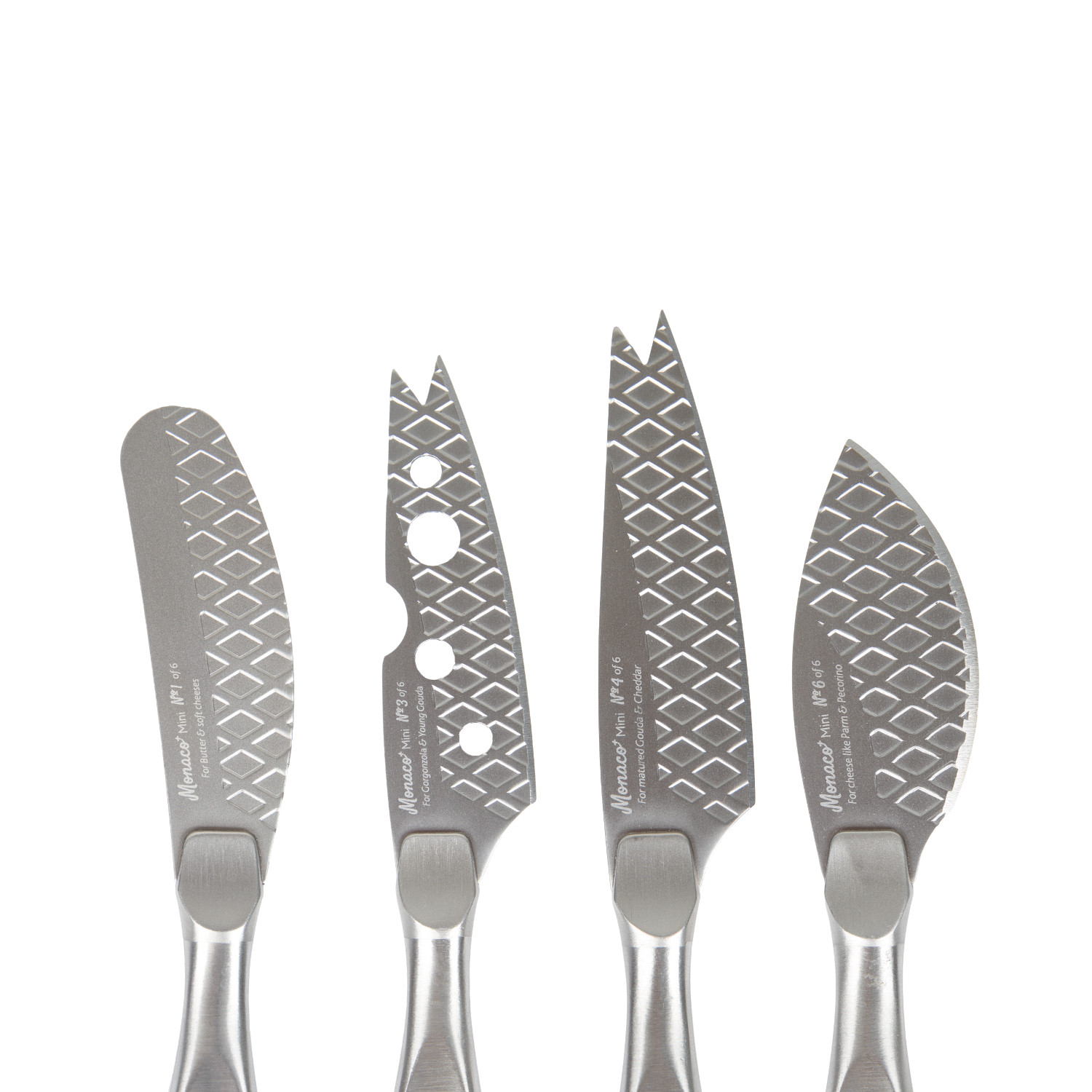 Zestaw Noży Mini Monaco+ to wyjątkowo, elegancki zestaw do sera od parmezanu do sera zupełnie mazistego do smarowania! W skład zestawu wchodzi: nóż do serów twardych, o krótkiej, ostrej klindze, nóż do serów miękkich o rozwidlonym czubku, nóż chessy o klindze przypominającej ser z dziurami i czwarty nóż zaokrąglony do smarowania. Noże są wykonane w całości ze stali nierdzewnej, specjalny wzór na klindze, przypominającym pikowanie, sprawia, że ser nie przylega w trakcie krojenia. Zestaw zapakowany jest w elegancki kartonik i może być wyjątkowym upominkiem dla smakosza sera, który z pewnością doceni nie tylko jego walory użytkowe, ale również oryginalny design! Noże należy myć ręcznie.