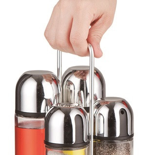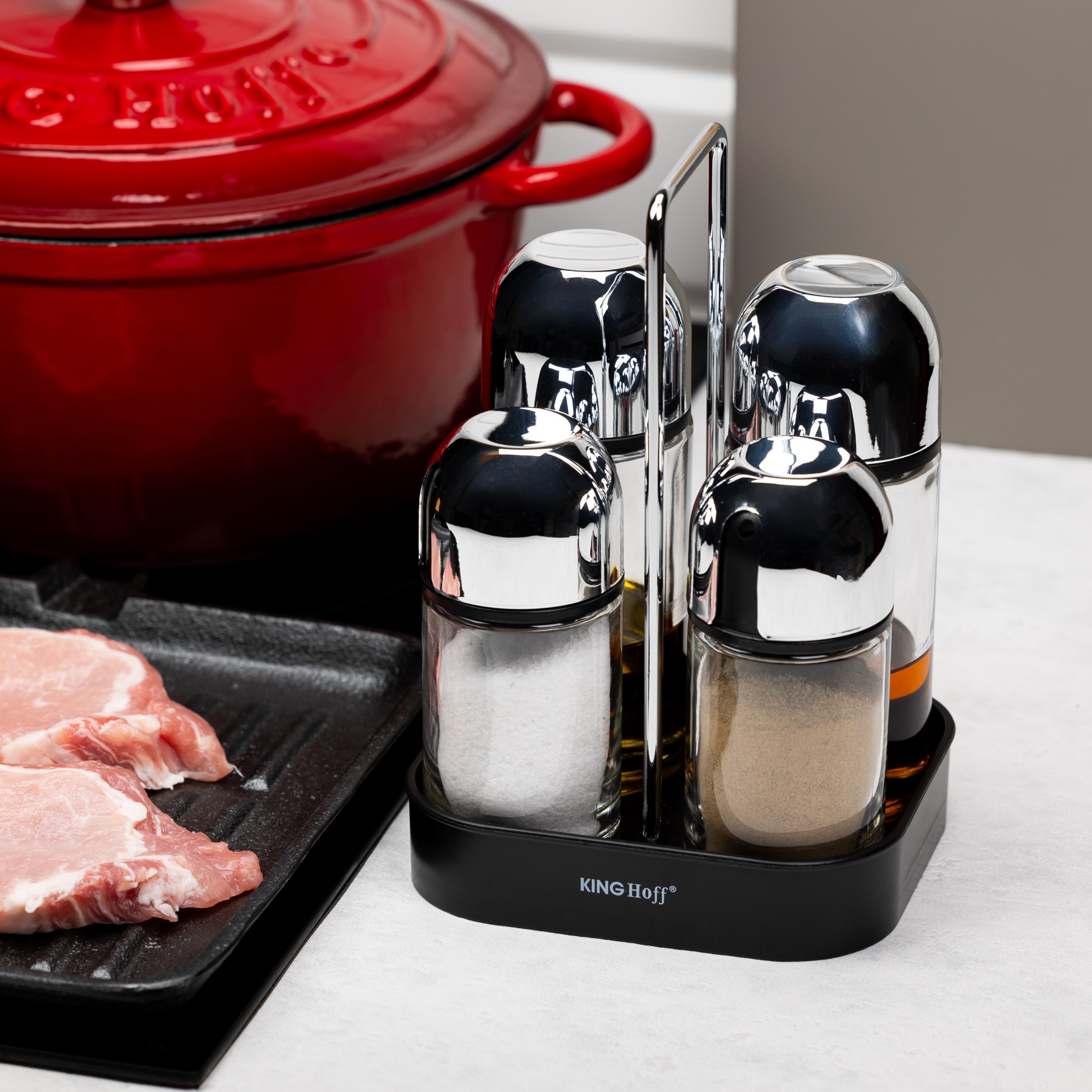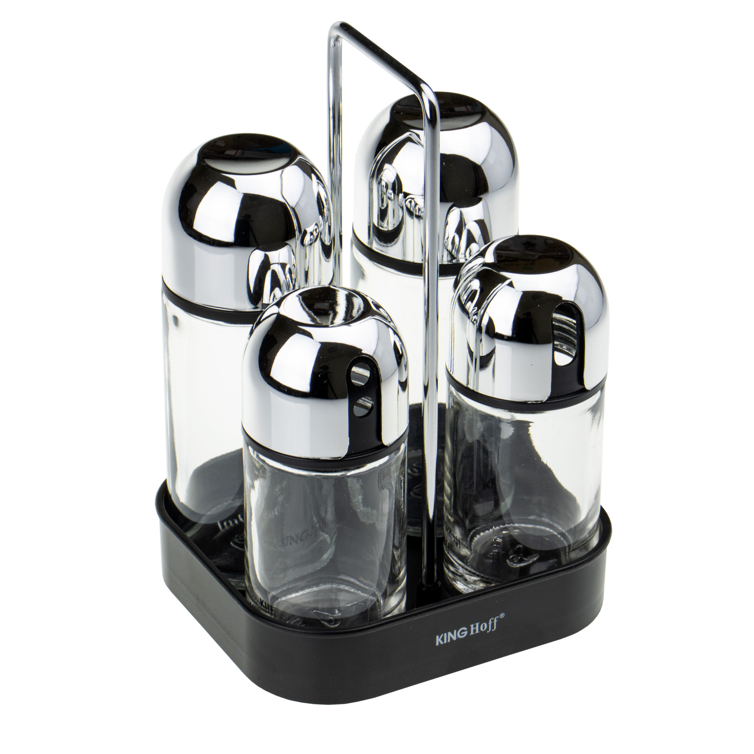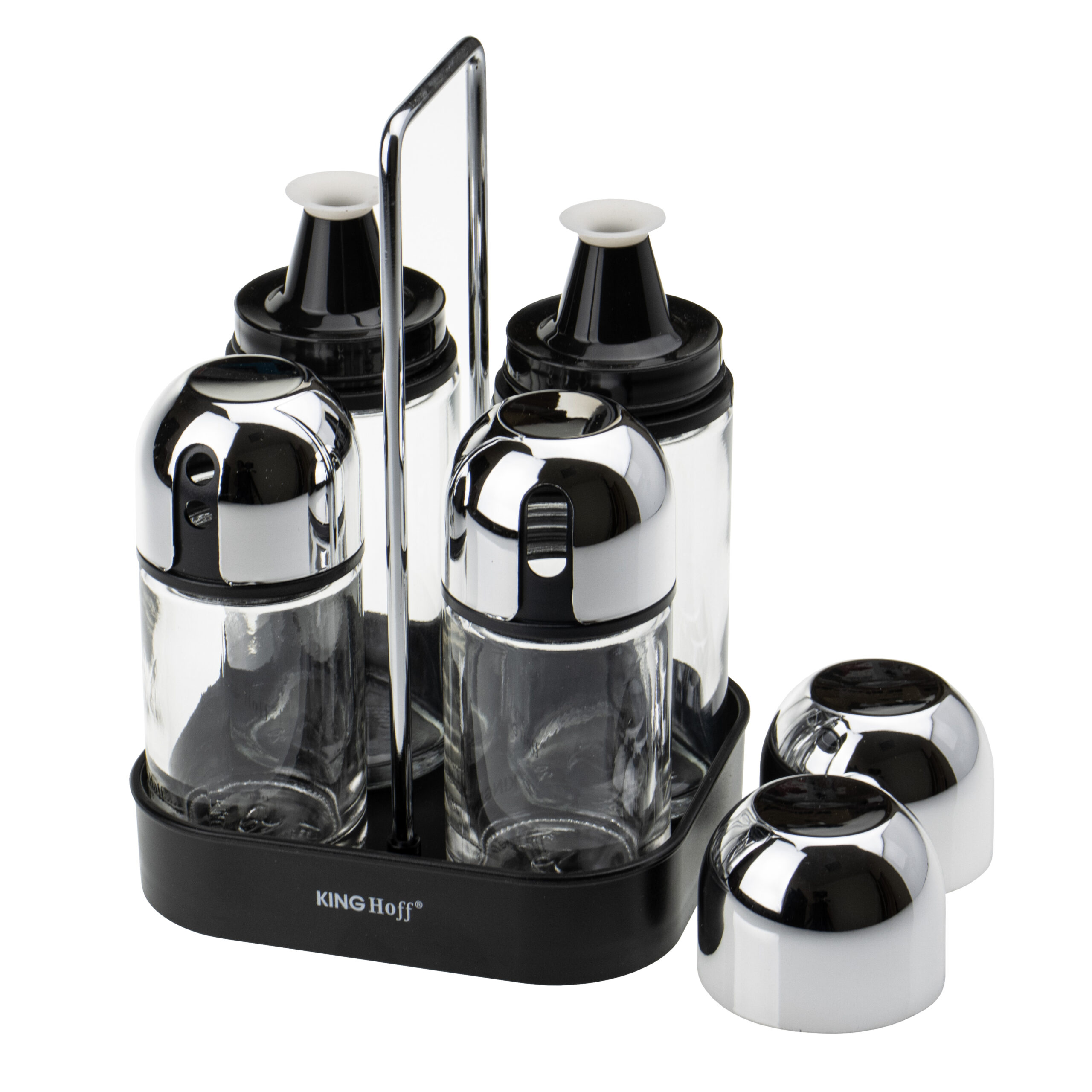 Komplet przyprawników składający się z solniczki pieprzniczki pojemnika do oliwy i octu, wykonany jest ze szkła, które charakteryzuje się eleganckim, ponadczasowym wyglądem i prostym designem. Szklane naczynia świetnie pasują do każdej zastawy stołowej oraz wystroju kuchni. Ponadto są łatwe w utrzymaniu czystości i higieniczne.
