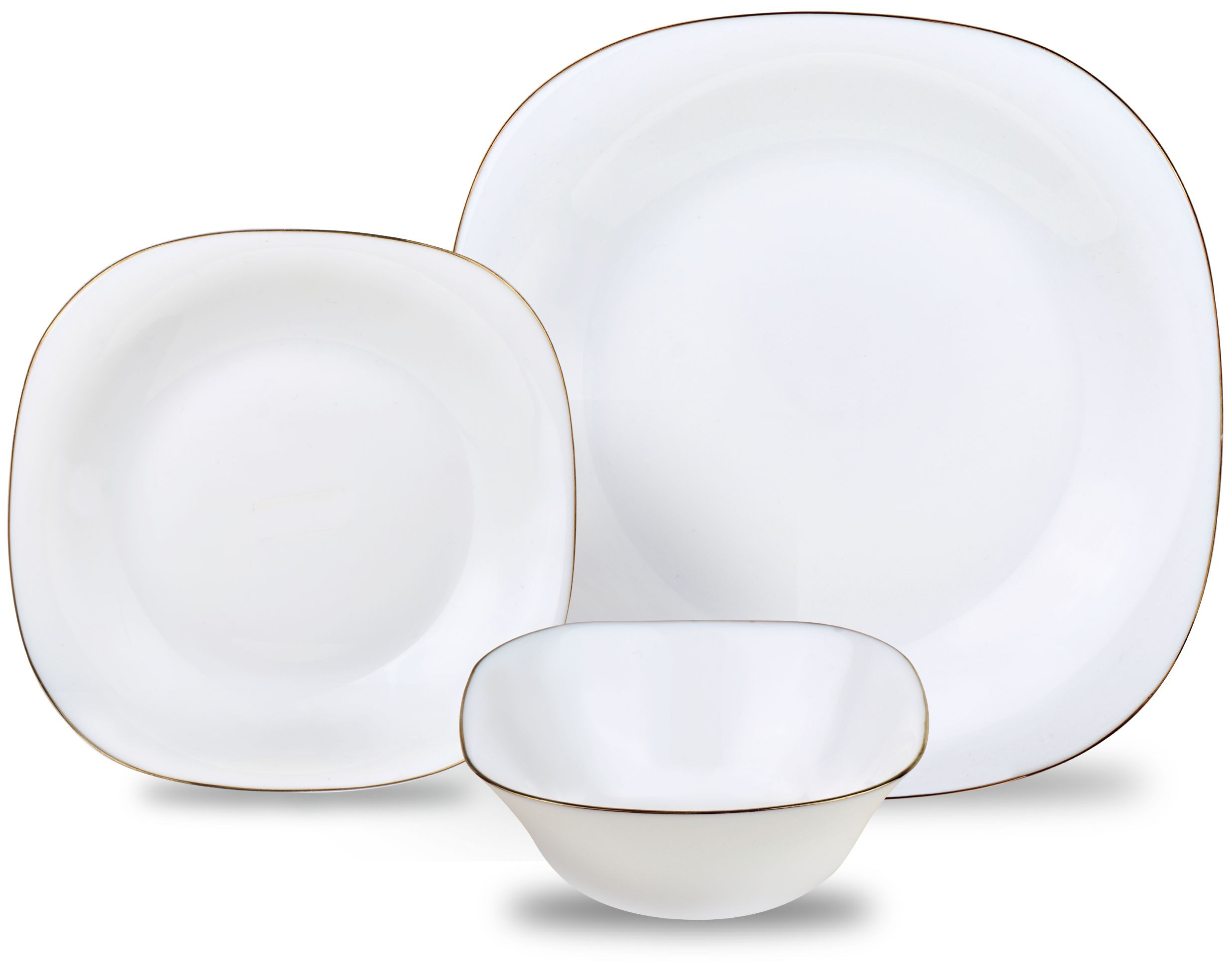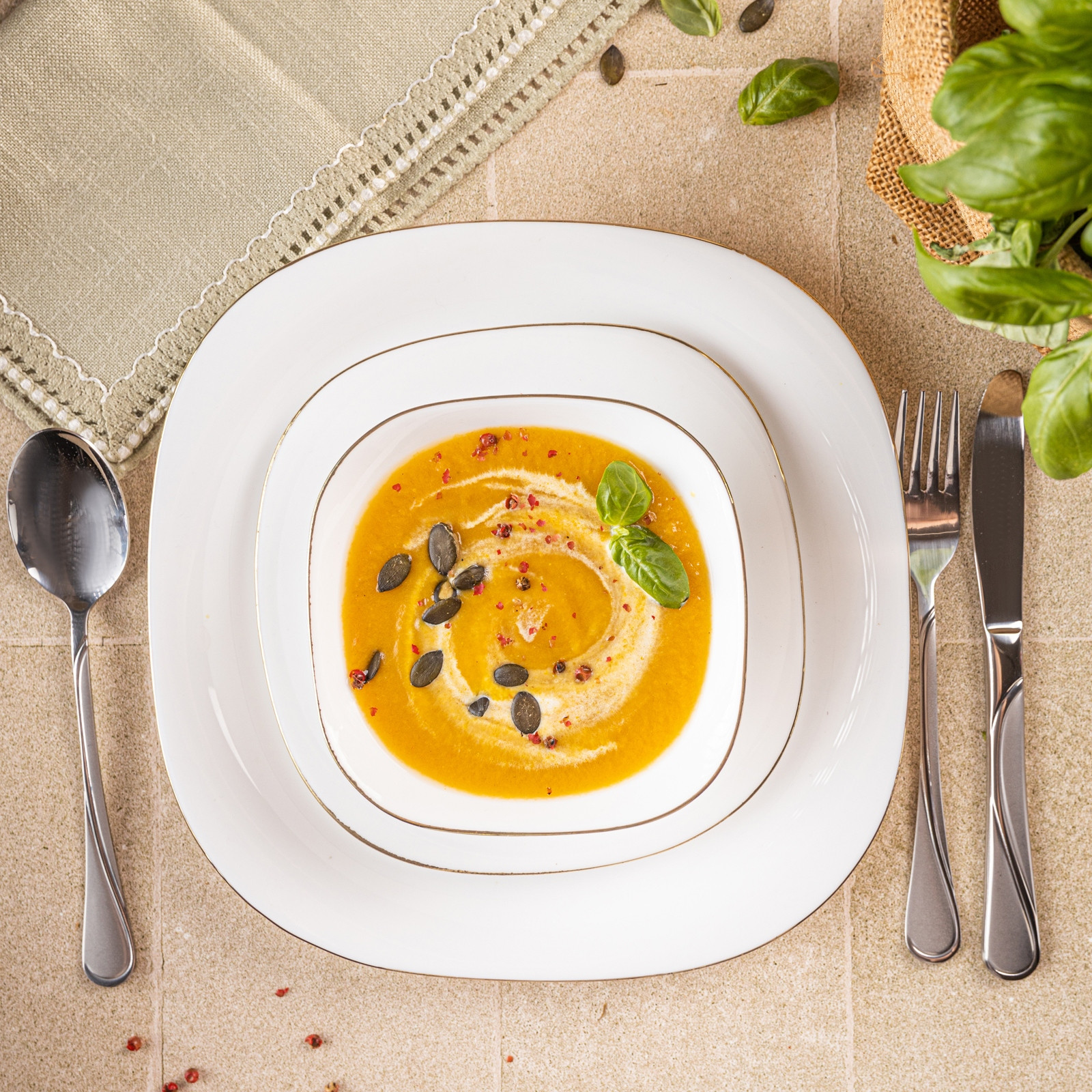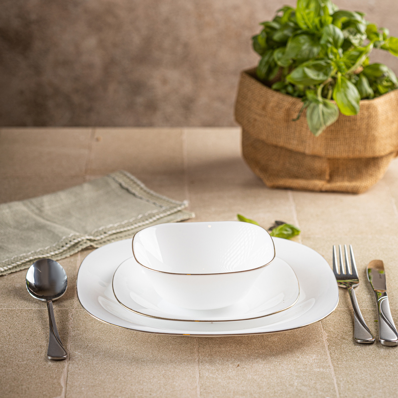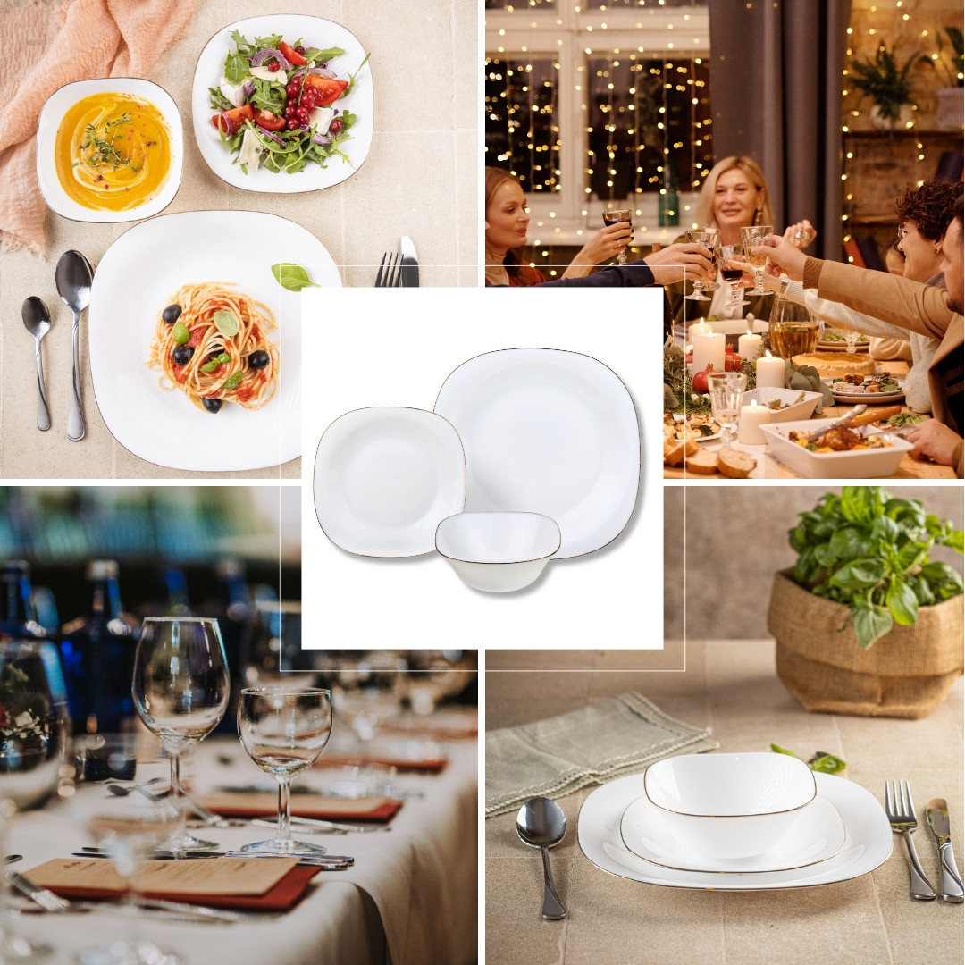 Jeśli szukasz nietuzinkowej zastawy, która podkreśli wyjątkowy charakter Twoich posiłków, zestaw talerzy TOPAZ będzie idealnym wyborem. Kwadratowa forma z zaokrąglonymi krawędziami oraz subtelne złote zdobienie nadają mu nowoczesnego, a zarazem wyrafinowanego stylu. Zestaw wykonany z trwałego szkła opalowego to idealne połączenie estetyki i funkcjonalności.