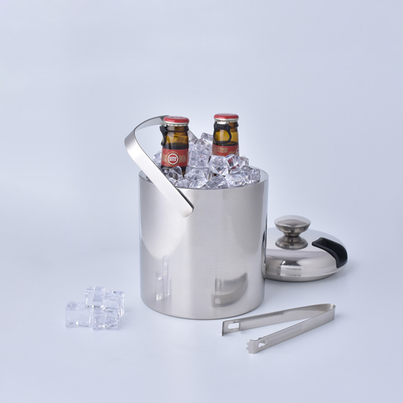 Komplet wykonany z nierdzewnej stali wiaderko do lodu sprawdzi się nie tylko w barze ale także w domu. Pojemnik na lód ma konstrukcję zapewniającą dobrą termoizolację, więc kostki dłużej utrzymają odpowiedni stan skupienia. W pokrywce wiaderka umieszczono szczypce do lodu. Możesz je tam schować i przechowywać w pełni higienicznie. Wiaderko na lód ma również uchwyt ułatwiający przenoszenie. Całość konstrukcji utrzymana jest w kolorze srebrnym z satynowym wykończeniem